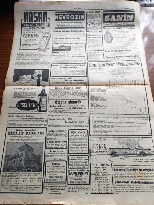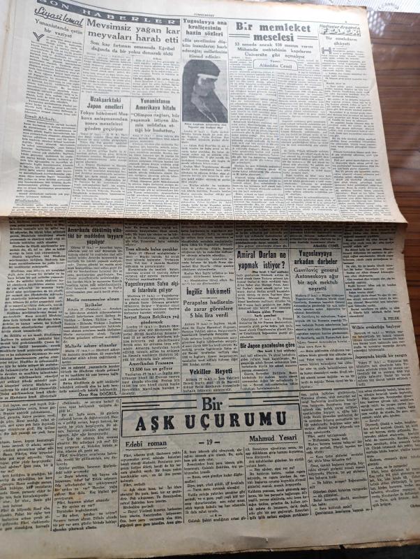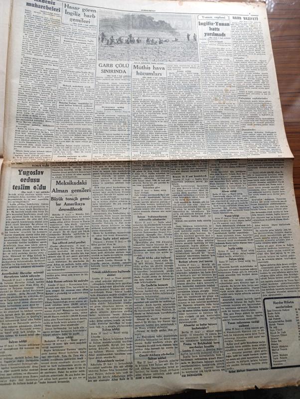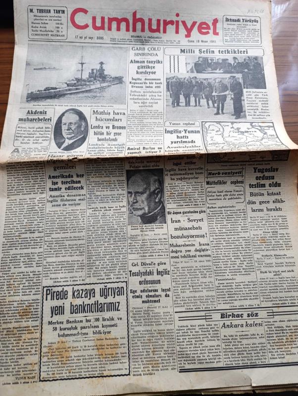 Cumhuriyet Gazetesi - 18 Nisan 1941 - Akdeniz Muharebeleri Yazan Yunus Nadi Köşe Yazısı - Amerikan Tersanelerinde İlk Olarak Tamir Edilen İngiliz Harb Gemilerinden Malaya Zırhlısı Fotoğraf - Garb Çölü Sınırında Alman Tazyiki Gittikçe Kırılıyor - Milli Şef İsmet İnönü'nün Tetkikleri - Amiral Darlan Ne Yapmak İstiyor - İngiliz Yunan Hattı Yarılmadı - Yugoslav Ordusu Teslim Oldu - Bir Japon Gazetesine Göre İran Sovyet Münasebatı Bozuluyormuş - Küçük Hikâye Hasret Şarkısı Yazan Mükerrem Kamil Su - Tramvayda Kadın Biletçiler İşe Başladı Fotoğraf - Tophanede Yeni Bir Yolcu Salonu - Yugoslavya Ana Kraliçesi Mari'nin Hazin Sözleri - Mevsimsiz Yağan Kar Meyveleri Harap Etti - Edebi Roman Bir Aşk Uçurumu Yazan Mahmud Yesari Yazı Dizisi - Burhan Felek Köşe Yazısı - İki Esir Yazan Lajos Zilahy Yazı Dizisi - İstanbul Lisesi'nin Spor Bayramı - Alemdar Davutpaşa Maçı Fenerbahçe Stadında - Fransız Tiyatrosunda Halk Sanatkarı Naşid Ve Yaban Gülleri - Turan Tiyatrosunda Yavrunun Gecesi Hamiyet Yüceses adlı eser, Kitap > Süreli Yayınlar > Gazeteler > Türkiye > Genel > Günlük kategorisinde İkinci El olarak satıştadır.