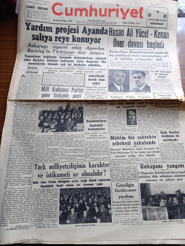 Cumhuriyet Gazetesi - 18 Nisan 1947 - Çekilmek Çekilmemek Yazan Nadir Nadi Başmakale - Yardım Projesi Ayanda Salıya Rey Konuyor - Hasan Ali Yücel Kenan Öner Davası Başladı - Milli Kalkınma Partisi Gene Faaliyete Geçti - Ankara Valisi İzzeddin Çağpar Aleyhine Açılan Dava - Türk Milliyetçiliğinin Karakter Ve İstikameti Ne Olmalıdır - Unkapanı Davası Sanıkları Mahkeme Huzurunda Fotoğrafı - Gençliğin Darülacezeye Yardımı - İzmir At Yarışlarının Dördüncü Hafta Programı - Bekri Mustafa Fıkraları Yarın Çıkıyor - Şehir Dram Tiyatrosunda Köyde Bir Ay Piyesi - Adak Yazan Kemal Ragıp Yazı Dizisi - Büyük İtiraf Filmi Eser Haluk Tanju Reji Refik Kemal - Güreşçilerimiz Prag'da Hava Meydanında - Hobart Elektrik Kaynak Makineleri - Çapamarka - Bugünkü Radyo Programı - Borsa - Meşhur James Hafif Motosikletleri, Yunus Nadi tarafından kaleme alınmıştır. Cumhuriyet Gazetesi - 18 Nisan 1947 - Çekilmek Çekilmemek Yazan Nadir Nadi Başmakale - Yardım Projesi Ayanda Salıya Rey Konuyor - Hasan Ali Yücel Kenan Öner Davası Başladı - Milli Kalkınma Partisi Gene Faaliyete Geçti - Ankara Valisi İzzeddin Çağpar Aleyhine Açılan Dava - Türk Milliyetçiliğinin Karakter Ve İstikameti Ne Olmalıdır - Unkapanı Davası Sanıkları Mahkeme Huzurunda Fotoğrafı - Gençliğin Darülacezeye Yardımı - İzmir At Yarışlarının Dördüncü Hafta Programı - Bekri Mustafa Fıkraları Yarın Çıkıyor - Şehir Dram Tiyatrosunda Köyde Bir Ay Piyesi - Adak Yazan Kemal Ragıp Yazı Dizisi - Büyük İtiraf Filmi Eser Haluk Tanju Reji Refik Kemal - Güreşçilerimiz Prag'da Hava Meydanında - Hobart Elektrik Kaynak Makineleri - Çapamarka - Bugünkü Radyo Programı - Borsa - Meşhur James Hafif Motosikletleri adlı eser Türkçe dilindedir.