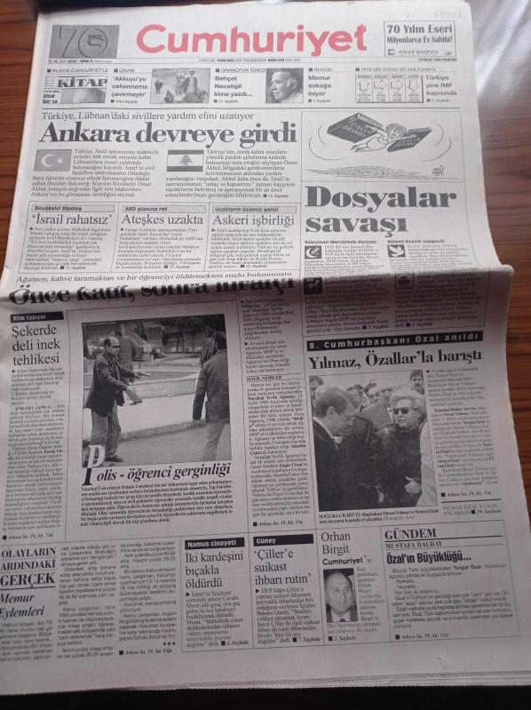 Cumhuriyet Gazetesi - 18 Nisan 1996 - Süleyman Mercümek Dosyası - Türkiye Lübnan'daki Sivillere Yardım Elini Uzatıyor - 8. Cumhurbaşkanı Turgut Özal Anıldı - Mesut Yılmaz Özallar'la Barıştı - Behçet Necatigil Kime Yazdı - Polis Öğrenci Gerginliği - Tansu Çiller'e Suikast İhbarı Rutin - İran Yanlısı Şeriatçı Hizbullah Örgütü - Nurullah Tevfik Ağansoy Önce Katil Sonra İtirafçı adlı eser, Kitap > Süreli Yayınlar > Gazeteler kategorisinde İkinci El olarak satıştadır.