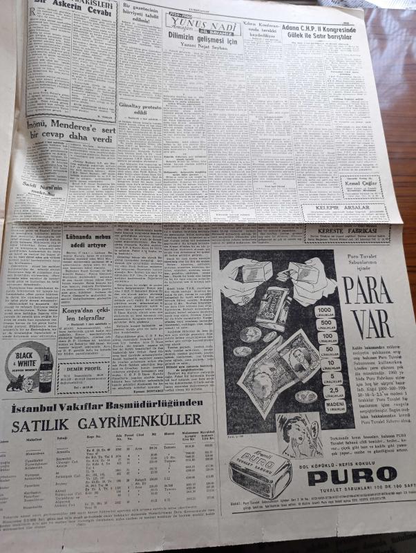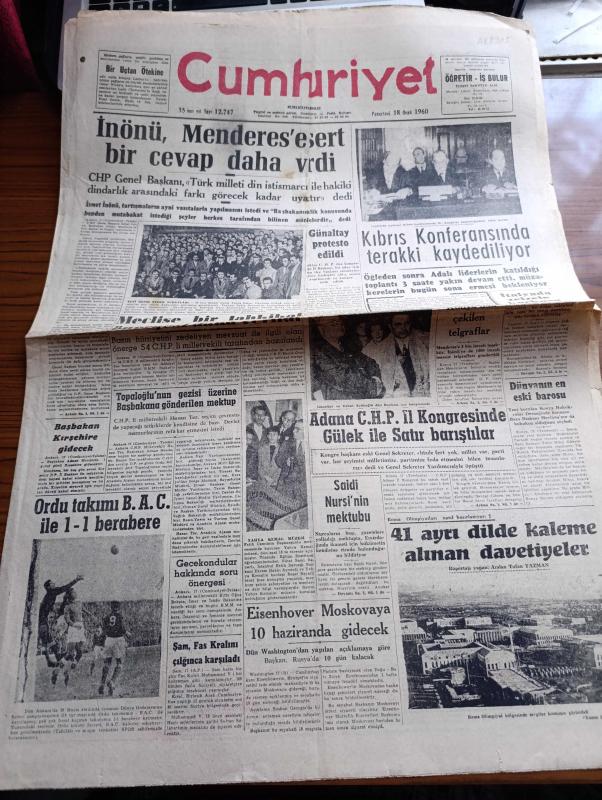 Cumhuriyet Gazetesi - 18 Ocak 1960 - İsmet İnönü Adnan Menderes'e Sert Bir Cevap Verdi - Kıbrıs Konferansında Gelişme Kaydediliyor - Yeni Deniz Yedek Subayları Fotoğrafı - Şemseddin Günaltay Protesto Edildi - Atıf Topaloğlu'nun Gezisi Üzerine Başbakan Adnan Menderes'e Gönderilen Mektuplar - Ordu Takımı Birleşik Arap Cumhuriyeti İle 1 1 Berabere Kaldı Fotoğraf - Adana CHP İl Kongresinde Kasım Gülek İle Kemal Satır Barıştılar - Roma Olimpiyatları Nasıl Hazırlanıyor Röportajı Yapan Arslan Tufan Yazman - Küçük Peyk'in Büyük Gazası Yazan Cemalettin Saraçoğlu Yazı Dizisi - İran Bütçesi Yazan Hasan Ali Yücel Köşe Yazısı - Taş Bebek Filmi Başrolde Gönül Yazar Göksel Arsoy Münir Özkul Atlas Sinemasında - Ocağın Ortasında Yazan Burhan Felek Köşe Yazısı - Çin'de Sarı Nehir Üzerinde 46 Baraj Kuruluyor - Resimli Roman Bir Çiçekle Yaz Olmaz Yazan ve Çizen Salih Erimez - Galatasaray Lucerne'i Dün 3 1 Mağlup Etti - Beşiktaş Altay'ı Da Yenemedi - Metin Oktay 3 Gol Attı - Spartak 4 Takviyeli Demirspor 4, Yunus Nadi tarafından kaleme alınmıştır. Cumhuriyet Gazetesi - 18 Ocak 1960 - İsmet İnönü Adnan Menderes'e Sert Bir Cevap Verdi - Kıbrıs Konferansında Gelişme Kaydediliyor - Yeni Deniz Yedek Subayları Fotoğrafı - Şemseddin Günaltay Protesto Edildi - Atıf Topaloğlu'nun Gezisi Üzerine Başbakan Adnan Menderes'e Gönderilen Mektuplar - Ordu Takımı Birleşik Arap Cumhuriyeti İle 1 1 Berabere Kaldı Fotoğraf - Adana CHP İl Kongresinde Kasım Gülek İle Kemal Satır Barıştılar - Roma Olimpiyatları Nasıl Hazırlanıyor Röportajı Yapan Arslan Tufan Yazman - Küçük Peyk'in Büyük Gazası Yazan Cemalettin Saraçoğlu Yazı Dizisi - İran Bütçesi Yazan Hasan Ali Yücel Köşe Yazısı - Taş Bebek Filmi Başrolde Gönül Yazar Göksel Arsoy Münir Özkul Atlas Sinemasında - Ocağın Ortasında Yazan Burhan Felek Köşe Yazısı - Çin'de Sarı Nehir Üzerinde 46 Baraj Kuruluyor - Resimli Roman Bir Çiçekle Yaz Olmaz Yazan ve Çizen Salih Erimez - Galatasaray Lucerne'i Dün 3 1 Mağlup Etti - Beşiktaş Altay'ı Da Yenemedi - Metin Oktay 3 Gol Attı - Spartak 4 Takviyeli Demirspor 4 adlı eser Türkçe dilindedir.