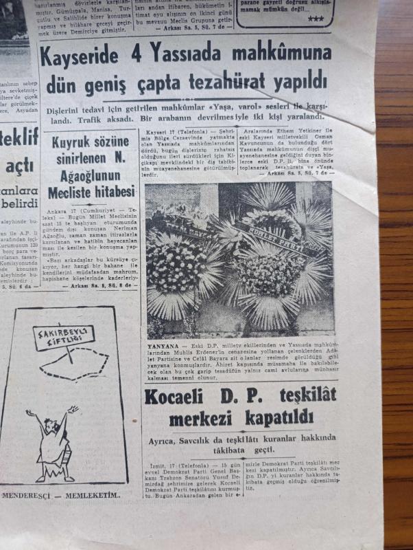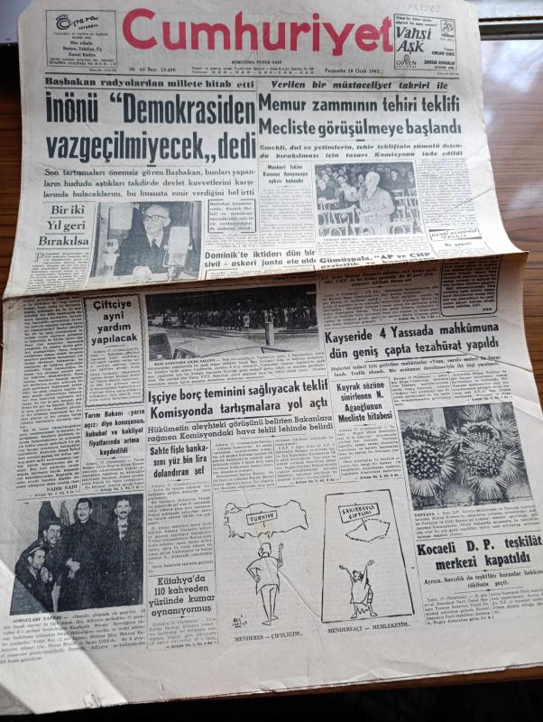 Cumhuriyet Gazetesi - 18 Ocak 1962 - Başbakan İsmet İnönü Demokrasiden Vazgeçilmeyecek Dedi - Bir İki Yıl Geri Bırakılsa Yazan Nadir Nadi Köşe Yazısı - Dominikte İktidarı Dün Bir Sivil Askeri Cunta Ele Aldı - Ragıp Gümüşpala Adalet Partisi Ve CHP Gericilik Ve Komünizmi Tenkil Edecektir Dedi - Kayseri'de 4 Yassıada Mahkumuna Dün Geniş Çapta Tezahürat Yapıldı - Erguvan Ağacı Yazan A. J. Cronin Yazı Dizisi - Soğuk Algınlığına Karşı Vicks - Tiyatro Cüneyt Gökçer Ne Diyor Yazan Lütfi Ay - Devlet İşleri Yazan Burhan Felek Köşe Yazısı - Mussolini'nin Oğlu İle Sophia Loren'in Kız Kardeşi Üç Mart'ta Evleniyorlar - İstatistikler Fransız Halkının Brigitte Bardot'tan Bıktığını Söylüyor - Bay Oscar Karikatür - İstanbul'un Taşı Toprağı Yazan Orhan Kemal Yazı Dizisi - Bugünkü Radyo Programı - Dolmabahçe Stadına Nihayet Dün Işıklandırma Direklerinin İlki Dikildi - İstanbul Kız Lisesi Voleybolda Şampiyon - Fenerbahçe Beşiktaş Rövanşı Oynuyorlar - Gripin, Yunus Nadi tarafından kaleme alınmıştır. Cumhuriyet Gazetesi - 18 Ocak 1962 - Başbakan İsmet İnönü Demokrasiden Vazgeçilmeyecek Dedi - Bir İki Yıl Geri Bırakılsa Yazan Nadir Nadi Köşe Yazısı - Dominikte İktidarı Dün Bir Sivil Askeri Cunta Ele Aldı - Ragıp Gümüşpala Adalet Partisi Ve CHP Gericilik Ve Komünizmi Tenkil Edecektir Dedi - Kayseri'de 4 Yassıada Mahkumuna Dün Geniş Çapta Tezahürat Yapıldı - Erguvan Ağacı Yazan A. J. Cronin Yazı Dizisi - Soğuk Algınlığına Karşı Vicks - Tiyatro Cüneyt Gökçer Ne Diyor Yazan Lütfi Ay - Devlet İşleri Yazan Burhan Felek Köşe Yazısı - Mussolini'nin Oğlu İle Sophia Loren'in Kız Kardeşi Üç Mart'ta Evleniyorlar - İstatistikler Fransız Halkının Brigitte Bardot'tan Bıktığını Söylüyor - Bay Oscar Karikatür - İstanbul'un Taşı Toprağı Yazan Orhan Kemal Yazı Dizisi - Bugünkü Radyo Programı - Dolmabahçe Stadına Nihayet Dün Işıklandırma Direklerinin İlki Dikildi - İstanbul Kız Lisesi Voleybolda Şampiyon - Fenerbahçe Beşiktaş Rövanşı Oynuyorlar - Gripin adlı eser Türkçe dilindedir.