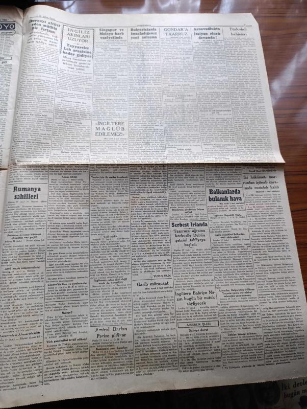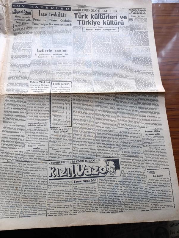 Cumhuriyet Gazetesi - 18 Şubat 1941 - Yeni Türk Bulgar Anlaşması İmzalandı - İki Hükümet Taarruzdan İçtinab Kararında Mutabık Kaldılar - Nihai Safhaya Giren Libya Harekatından En Yeni Resimler - Hariciye Vekilimiz Şükrü Saracoğlu - Gondar'a Taarruz Başladı - İngiltere Mağlup Edilemez - Singapur Ve Malaya Harp Vaziyetinde - Büyük Muasırlar Yazan Winston Churchill Yazı Dizisi - Küçük Hikaye İbo'nun Çocuğu Yazan Nuri Refik - Yeni Tramvay Hatları - Surpagop Mezarlığında Yapılacak Mahalle - Türk Kültürleri Ve Türkiye Kültürü Yazan İsmail Hami Danişmend - Kızıl Vazo Yazan Peride Celal Yazı Dizisi - Sessiz Tayyare Yazan Burhan Felek Köşe Yazısı - Libya Muzafferiyetinden Resimler - Senenin En Büyük Aşk Ve Macera Şaheseri Yeşil Cehennem Sümer Sinemasında - Bakir Adam Bu Perşembe Lale Sinemasında - Siera Radyosu - İsviçre'nin Presizyon Saati Marvin - Galata Perşembe Pazarı - Singer Yeni Spor Saatleri Geldi, Yunus Nadi tarafından kaleme alınmıştır. Cumhuriyet Gazetesi - 18 Şubat 1941 - Yeni Türk Bulgar Anlaşması İmzalandı - İki Hükümet Taarruzdan İçtinab Kararında Mutabık Kaldılar - Nihai Safhaya Giren Libya Harekatından En Yeni Resimler - Hariciye Vekilimiz Şükrü Saracoğlu - Gondar'a Taarruz Başladı - İngiltere Mağlup Edilemez - Singapur Ve Malaya Harp Vaziyetinde - Büyük Muasırlar Yazan Winston Churchill Yazı Dizisi - Küçük Hikaye İbo'nun Çocuğu Yazan Nuri Refik - Yeni Tramvay Hatları - Surpagop Mezarlığında Yapılacak Mahalle - Türk Kültürleri Ve Türkiye Kültürü Yazan İsmail Hami Danişmend - Kızıl Vazo Yazan Peride Celal Yazı Dizisi - Sessiz Tayyare Yazan Burhan Felek Köşe Yazısı - Libya Muzafferiyetinden Resimler - Senenin En Büyük Aşk Ve Macera Şaheseri Yeşil Cehennem Sümer Sinemasında - Bakir Adam Bu Perşembe Lale Sinemasında - Siera Radyosu - İsviçre'nin Presizyon Saati Marvin - Galata Perşembe Pazarı - Singer Yeni Spor Saatleri Geldi adlı eser Türkçe dilindedir.