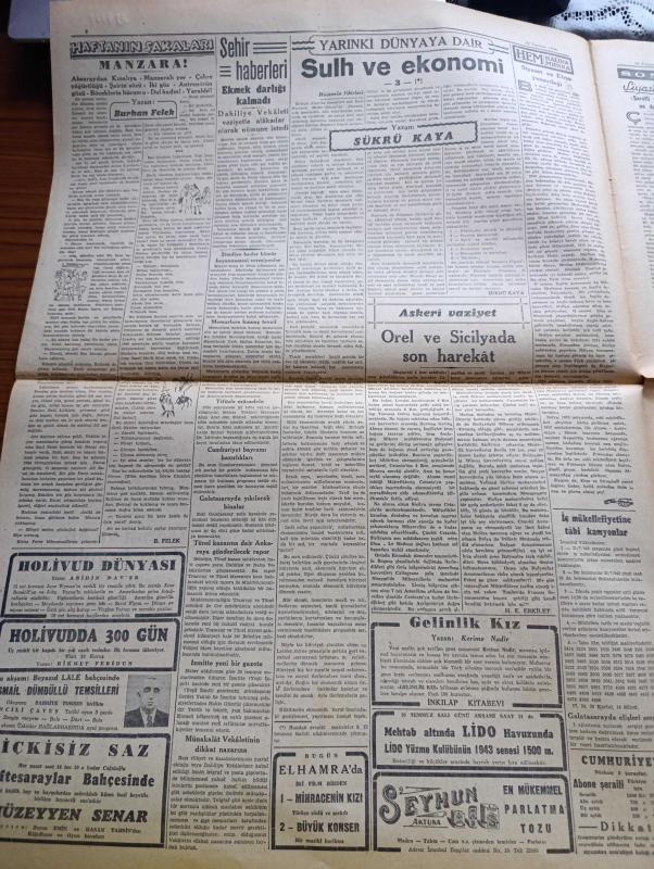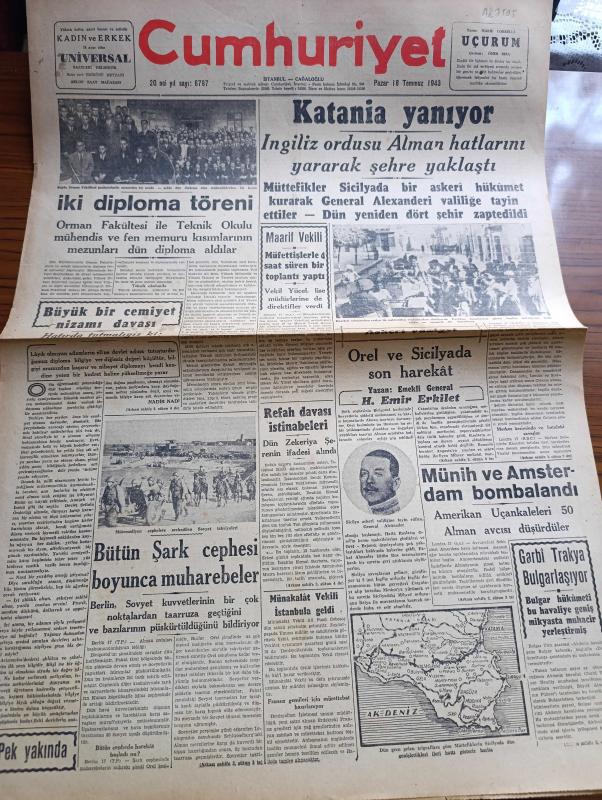 Cumhuriyet Gazetesi - 18 Temmuz 1943 - Büyük Bir Cemiyet Nizamı Davası Yazan Nadir Nadi Köşe Yazısı - İki Diploma Töreni - Orman Fakültesi İle Teknik Okulu Mühendis Ve Fen Memuru Kısımlarının Mezunları Dün Diploma Aldılar - Katania Yanıyor - İngiliz Ordusu Alman Hatlarını Yararak Şehre Yaklaştı - Maarif Vekili Hasan Ali Yücel Müfettişlerle 4 Saat Süren Bir Toplantı Yaptı - Harekat Sahasında Radyo İle Nakledilen Resimlerden - Refah Vapuru Faciası Davası - Askeri Vaziyet Orel Ve Sicilyada Son Harekat Yazan Emekli General H. Emir Erkilet Yazı Dizisi - Münih Ve Amsterdam Bombalandı - Garbi Trakya Bulgarlaşıyor - İsmail Dümbüllü Temsilleri - Haftanın Şakaları Yazan Burhan Felek - Sulh Ve Ekonomi Yazan Şükrü Kaya - Cumhuriyet Bayramı Hazırlıkları - Sinemagazin Çıktı - Bugünkü At Yarışları - Bolu'da Atatürk Günü - Mim Çakır Gazinosunda Müzeyyen Senar Işıl - Kadıköy İnci Gazinosunda Mualla Ve Arkadaşları - Suad Gün Konseri YeşilPark Gazinosunda - Mualla Gökçay Konseri - Bugünkü Radyo Programı, Yunus Nadi tarafından kaleme alınmıştır. Cumhuriyet Gazetesi - 18 Temmuz 1943 - Büyük Bir Cemiyet Nizamı Davası Yazan Nadir Nadi Köşe Yazısı - İki Diploma Töreni - Orman Fakültesi İle Teknik Okulu Mühendis Ve Fen Memuru Kısımlarının Mezunları Dün Diploma Aldılar - Katania Yanıyor - İngiliz Ordusu Alman Hatlarını Yararak Şehre Yaklaştı - Maarif Vekili Hasan Ali Yücel Müfettişlerle 4 Saat Süren Bir Toplantı Yaptı - Harekat Sahasında Radyo İle Nakledilen Resimlerden - Refah Vapuru Faciası Davası - Askeri Vaziyet Orel Ve Sicilyada Son Harekat Yazan Emekli General H. Emir Erkilet Yazı Dizisi - Münih Ve Amsterdam Bombalandı - Garbi Trakya Bulgarlaşıyor - İsmail Dümbüllü Temsilleri - Haftanın Şakaları Yazan Burhan Felek - Sulh Ve Ekonomi Yazan Şükrü Kaya - Cumhuriyet Bayramı Hazırlıkları - Sinemagazin Çıktı - Bugünkü At Yarışları - Bolu'da Atatürk Günü - Mim Çakır Gazinosunda Müzeyyen Senar Işıl - Kadıköy İnci Gazinosunda Mualla Ve Arkadaşları - Suad Gün Konseri YeşilPark Gazinosunda - Mualla Gökçay Konseri - Bugünkü Radyo Programı adlı eser Türkçe dilindedir.