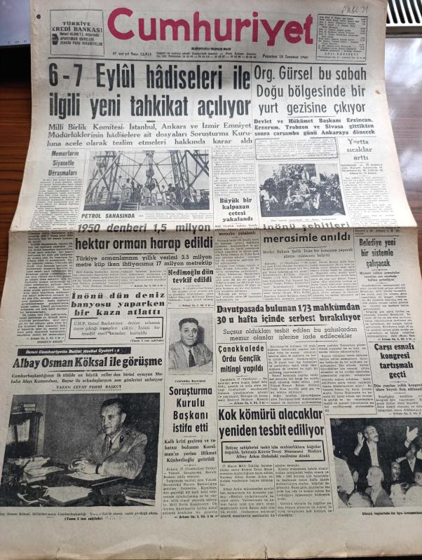 Cumhuriyet Gazetesi - 18 Temmuz 1960 - Memurların Siyasetle Uğraşmaları Yazan Feridun Ergin Köşe Yazısı - 6 7 Eylül Hadiseleri İle İlgili Yeni Tahkikat Açılıyor - İkinci Cumhuriyetin İhtilal Meclisi Üyeleri 4 Yazan Cevat Fehmi Başkut Yazı Dizisi - Albay Osman Köksal ile Görüşme - Sanayi Bakanı Muhtar Uluer Adana'da Petrol Sahasında - Orgeneral Cemal Gürsel Bu Sabah Doğu Bölgesinde Yurt Gezisine Çıkıyor - Belediye Yeni Bir Sistemle Çalışacak - Kok Kömürü Alacaklar Yeniden Tesbit Ediliyor - Davutpaşada Bulunan 173 Mahkumdan 30 u Hafta İçinde Serbest Bırakılıyor - Dümensiz Gemi Yazan Rikkat Köknar Yazı Dizisi - Tonguç Baba Ve Köy Enstitüleri Yazan Dr. Mediha Esenel - 9. Dil Kurultayı Yazan Hasan Ali Yücel Köşe Yazısı - Birleşik Arap Cumhuriyeti Küba'dan Tütün Alıyor - Eski Eoka Mensupları Kıbrıs'ta Bir Parti Kurdu - Resimli Roman Başkasının Günahı Çizen Yves Sayol - Kaatil Kim Yazan Geo Duvic Yazı Dizisi - Beşiktaş Atletizm Şampiyonu - Bisiklet Şampiyonasını Bedri Sakarya Kazandı adlı eser, Kitap > Süreli Yayınlar > Gazeteler > Türkiye > Genel > Günlük kategorisinde İkinci El olarak satıştadır.