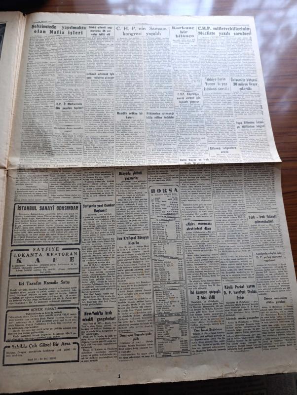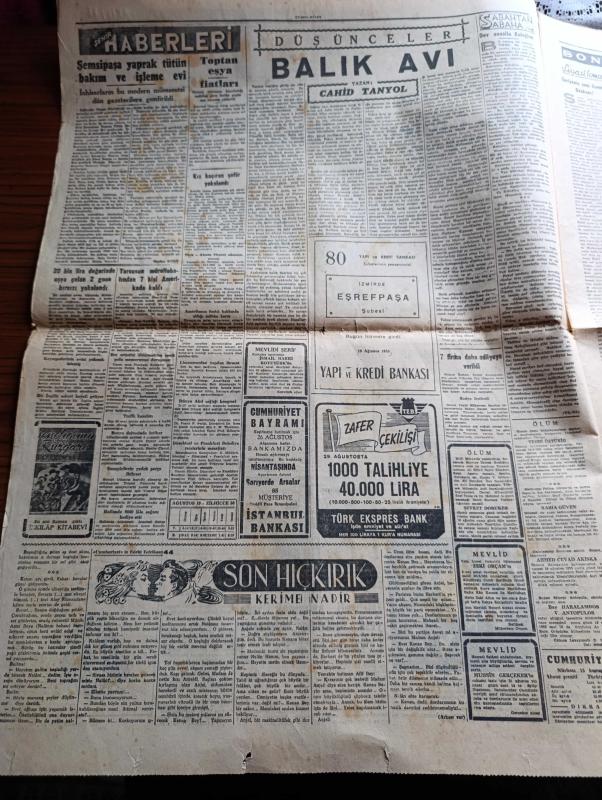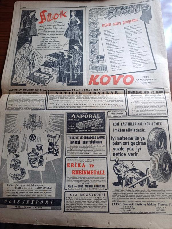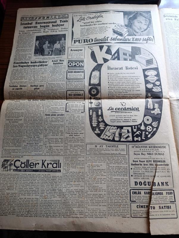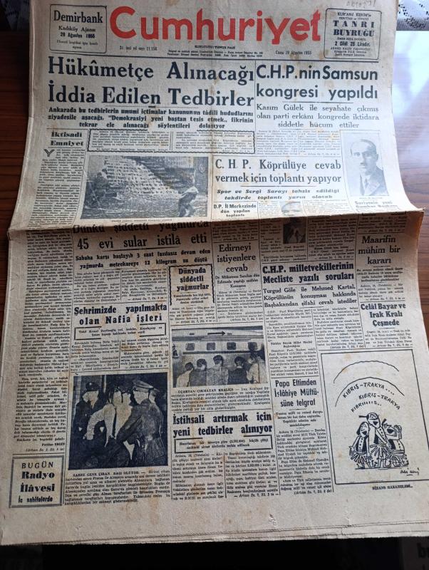 Cumhuriyet Gazetesi - 19 Ağustos 1955 - iktisadi emniyet yazan Feridun Ergin Başmakale - hükümetçe alınacağı iddia edilen tedbirler - CHP'nin Samsun kongresi yapıldı - dünkü yağmur esnasında bankalar caddesi fotoğraf - CHP Fuat köprülü'ye cevap vermek için toplantı yapıyor - Suriye'nin yeni cumhurbaşkanı Şükrü El Kuvvetli - Celal Bayar ve Irak Kralı çeşme'de - Son Hıçkırık yazan Kerime Nadir Yazı Dizisi - dev anasıyla keloğlan yazan Va Nü - Dünya Bankası'nın çıkardığı güçlük - Kore'de kızıllar Bir Amerikan uçağını düşürdüler - neden İstanbul değil de Constantinople - bugünkü radyo programı - churchill'in gölgesi yazan W. H. Thompson yazı dizisi - Haldun Dormen tiyatrosu - bugüne kadar yapılan filmlerin En pahalısı Büyük İskender - İstanbul enternasyonal tenis turnuvası bugün başlıyor - Fenerbahçe basketbolcuları yugoslavya'ya gidiyor - Vefa ilk hazırlık maçını Yavuz Sultan Selim ile yapacak - Lale Oraloğlu puro tuvalet sabunu kullanıyor - Kovo Satış Programı - Papa Eftim'den telgraf, Yunus Nadi tarafından kaleme alınmıştır. Cumhuriyet Gazetesi - 19 Ağustos 1955 - iktisadi emniyet yazan Feridun Ergin Başmakale - hükümetçe alınacağı iddia edilen tedbirler - CHP'nin Samsun kongresi yapıldı - dünkü yağmur esnasında bankalar caddesi fotoğraf - CHP Fuat köprülü'ye cevap vermek için toplantı yapıyor - Suriye'nin yeni cumhurbaşkanı Şükrü El Kuvvetli - Celal Bayar ve Irak Kralı çeşme'de - Son Hıçkırık yazan Kerime Nadir Yazı Dizisi - dev anasıyla keloğlan yazan Va Nü - Dünya Bankası'nın çıkardığı güçlük - Kore'de kızıllar Bir Amerikan uçağını düşürdüler - neden İstanbul değil de Constantinople - bugünkü radyo programı - churchill'in gölgesi yazan W. H. Thompson yazı dizisi - Haldun Dormen tiyatrosu - bugüne kadar yapılan filmlerin En pahalısı Büyük İskender - İstanbul enternasyonal tenis turnuvası bugün başlıyor - Fenerbahçe basketbolcuları yugoslavya'ya gidiyor - Vefa ilk hazırlık maçını Yavuz Sultan Selim ile yapacak - Lale Oraloğlu puro tuvalet sabunu kullanıyor - Kovo Satış Programı - Papa Eftim'den telgraf adlı eser Türkçe dilindedir.