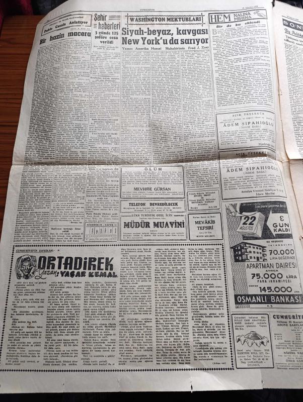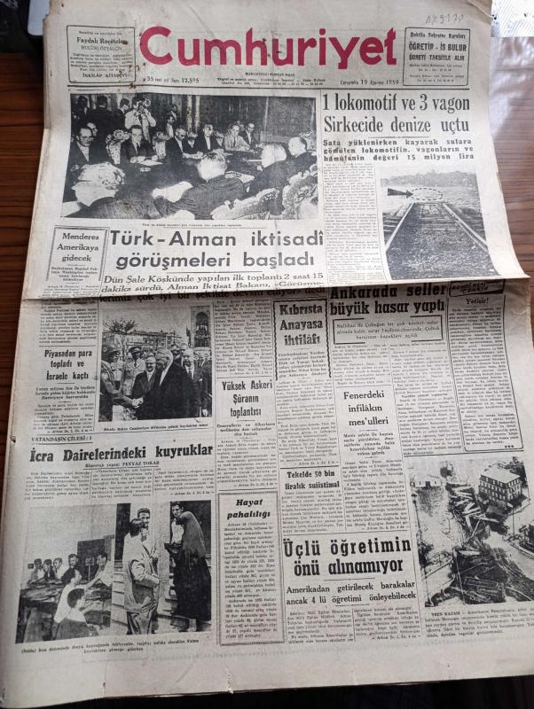 Cumhuriyet Gazetesi - 19 Ağustos 1959 - Türk Alman İktisadi Görüşmeleri Şale Köşkünde Başladı Fotoğraf - Başbakan Adnan Menderes Amerikaya Gidecek - 1 Lokomotif Ve 3 Vagon Sirkecide Denize Uçtu - Yüksek Askeri Şuranın Toplantısı - Ortadirek Yazan Yaşar Kemal Yazı Dizisi - Siyah Beyaz Kavgası New York'u Sarıyor - Amerika'da Şiddetli Bir Deprem Oldu - Uluç Ali Yazan Halikarnas Balıkçısı Yazı Dizisi - Köy Enstitelerine Dair Bir Amerikalının Görüşü -Film Yıldızı Rosalind Russell İyi Ki Çok Genç Evlenmedim Diyor - İstanbul Ankara Radyosu Programı - Rus Başbakanı Hrutçef De Gaulle İle Buluşmak İstiyor - Kalamış Yüzme Kupası Müsabakalarında Sevgi Duru Ve Münevver Tarım Rekor Kırdı - Galatasaraylı Suat Mamat Avrupa'dan Hasta Olarak Döndü - Tenisçi Alman Scholl İtalyan Pietrangeli'yi Eledi - Alman İsar Su Perileri Yüzme Takımı Son Antrenmanını Yaptı - İsveç Albin Deniz Motorları - Modaspor'un Deniz Bayramı Cuma Günü - İstanbul Kulüplerarası Boks Şampiyonası 26 Ağustos'ta, Yunus Nadi tarafından kaleme alınmıştır. Cumhuriyet Gazetesi - 19 Ağustos 1959 - Türk Alman İktisadi Görüşmeleri Şale Köşkünde Başladı Fotoğraf - Başbakan Adnan Menderes Amerikaya Gidecek - 1 Lokomotif Ve 3 Vagon Sirkecide Denize Uçtu - Yüksek Askeri Şuranın Toplantısı - Ortadirek Yazan Yaşar Kemal Yazı Dizisi - Siyah Beyaz Kavgası New York'u Sarıyor - Amerika'da Şiddetli Bir Deprem Oldu - Uluç Ali Yazan Halikarnas Balıkçısı Yazı Dizisi - Köy Enstitelerine Dair Bir Amerikalının Görüşü -Film Yıldızı Rosalind Russell İyi Ki Çok Genç Evlenmedim Diyor - İstanbul Ankara Radyosu Programı - Rus Başbakanı Hrutçef De Gaulle İle Buluşmak İstiyor - Kalamış Yüzme Kupası Müsabakalarında Sevgi Duru Ve Münevver Tarım Rekor Kırdı - Galatasaraylı Suat Mamat Avrupa'dan Hasta Olarak Döndü - Tenisçi Alman Scholl İtalyan Pietrangeli'yi Eledi - Alman İsar Su Perileri Yüzme Takımı Son Antrenmanını Yaptı - İsveç Albin Deniz Motorları - Modaspor'un Deniz Bayramı Cuma Günü - İstanbul Kulüplerarası Boks Şampiyonası 26 Ağustos'ta adlı eser Türkçe dilindedir.