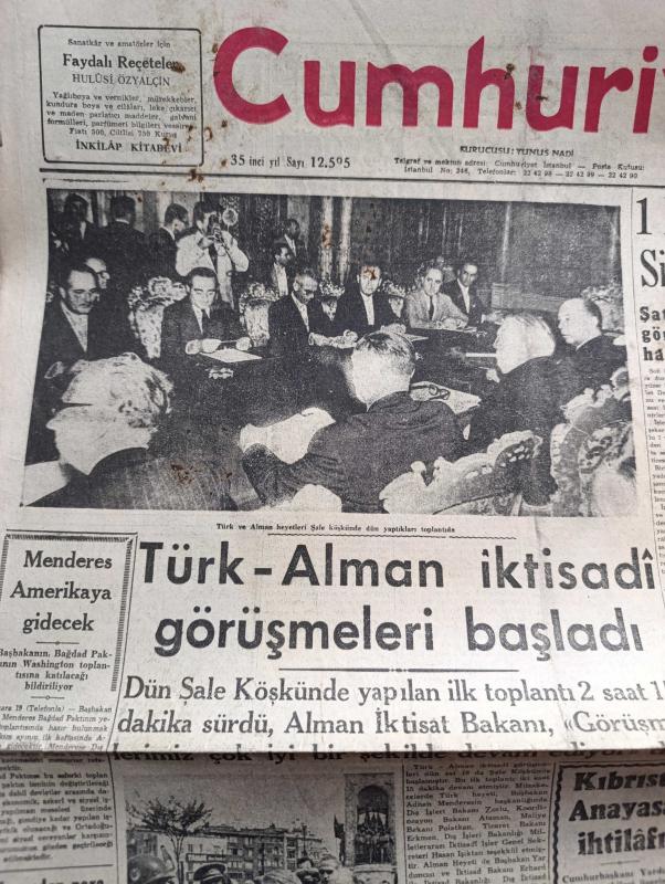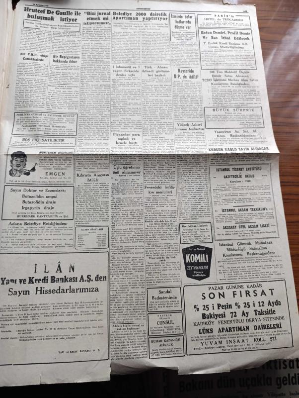 Cumhuriyet Gazetesi - 19 Ağustos 1959 - Türk Alman İktisadi Görüşmeleri Şale Köşkünde Başladı Fotoğraf - Başbakan Adnan Menderes Amerikaya Gidecek - 1 Lokomotif Ve 3 Vagon Sirkecide Denize Uçtu - Yüksek Askeri Şuranın Toplantısı - Ortadirek Yazan Yaşar Kemal Yazı Dizisi - Siyah Beyaz Kavgası New York'u Sarıyor - Amerika'da Şiddetli Bir Deprem Oldu - Uluç Ali Yazan Halikarnas Balıkçısı Yazı Dizisi - Köy Enstitelerine Dair Bir Amerikalının Görüşü -Film Yıldızı Rosalind Russell İyi Ki Çok Genç Evlenmedim Diyor - İstanbul Ankara Radyosu Programı - Rus Başbakanı Hrutçef De Gaulle İle Buluşmak İstiyor - Kalamış Yüzme Kupası Müsabakalarında Sevgi Duru Ve Münevver Tarım Rekor Kırdı - Galatasaraylı Suat Mamat Avrupa'dan Hasta Olarak Döndü - Tenisçi Alman Scholl İtalyan Pietrangeli'yi Eledi - Alman İsar Su Perileri Yüzme Takımı Son Antrenmanını Yaptı - İsveç Albin Deniz Motorları - Modaspor'un Deniz Bayramı Cuma Günü - İstanbul Kulüplerarası Boks Şampiyonası 26 Ağustos'ta adlı eser, Kitap > Süreli Yayınlar > Gazeteler > Türkiye > Genel > Günlük kategorisinde İkinci El olarak satıştadır.