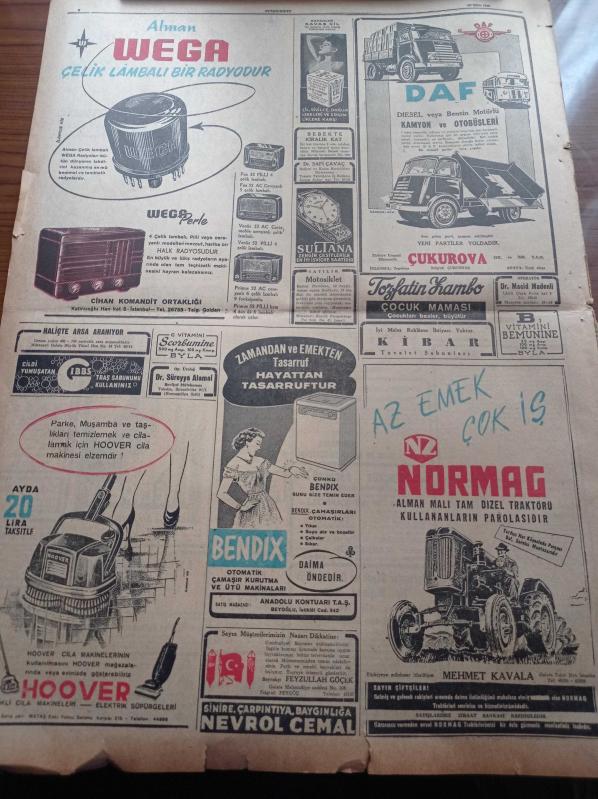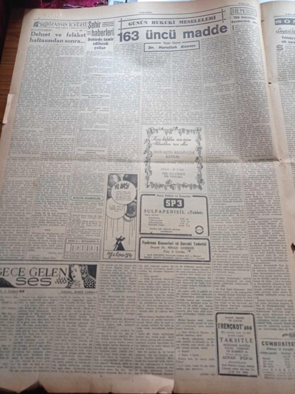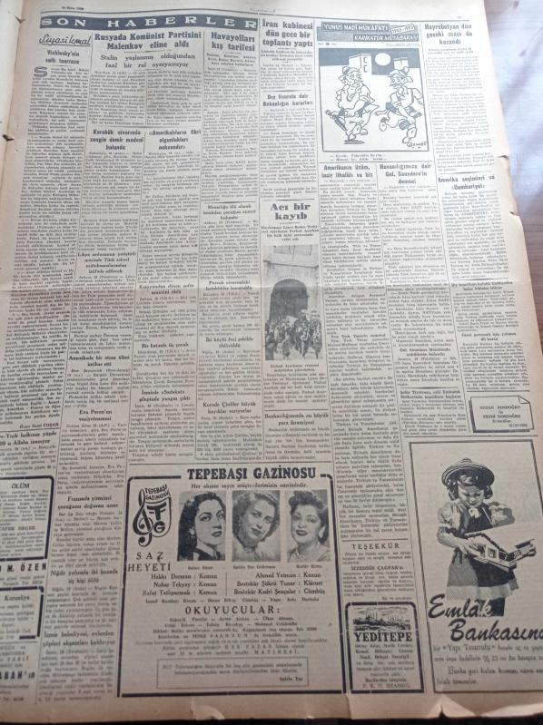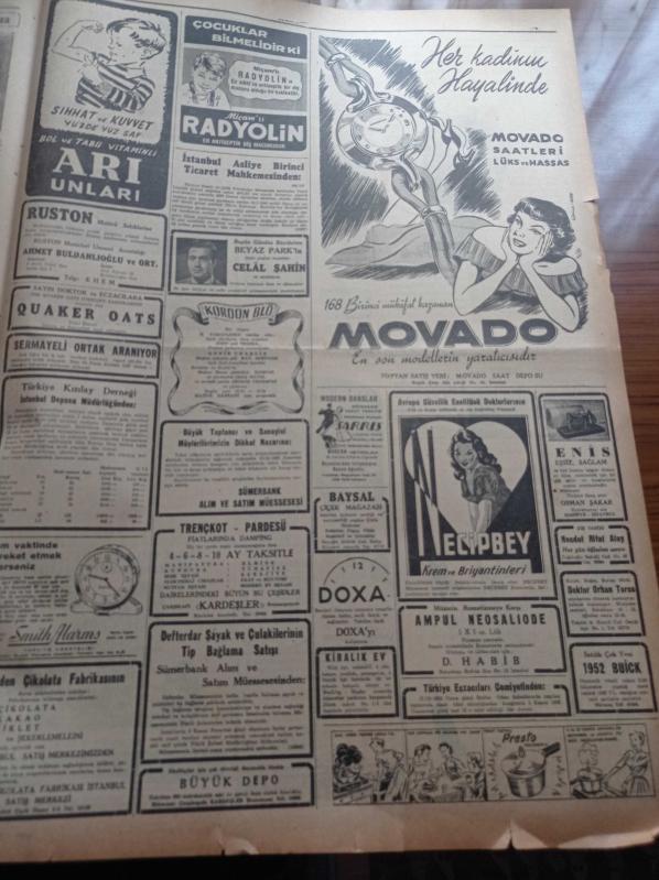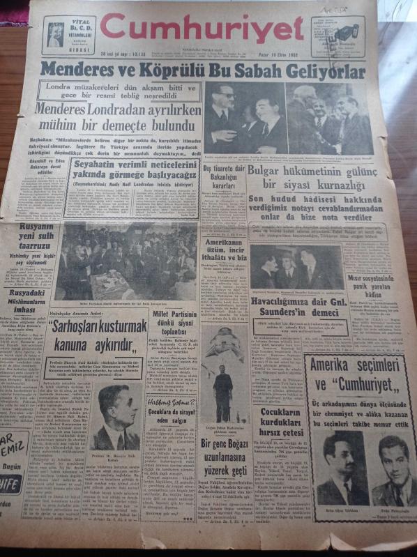 Cumhuriyet Gazetesi - 19 Ekim 1952 - Adnan Menderes Ve Fuat Köprülü Bu Sabah Geliyorlar - Adnan Menderes Londra'dan Ayrılırken Mühim Bir Demeçte Bulundu - Churchill ve Eden Ankara'ya Davet Edildiler - Rusya'daki Müslümanların İmhası - Doğan Şahin Boğazı Uzunlamasına Yüzerek Geçti - Amerikan Seçimleri Ve Cumhuriyet - Havacılığımıza Dair Saunders'in Demeci- Doktor Nurullah Kunter - İçişleri Bakanı Ethem Menderes- Amerika'da Atom Bilgini John Lane İntihar Etti - Rusya'da Komünist Partisini Malenkov Eline Aldı - Saime Sinan Sabite Tur Gülerman Ve Radife Erten Tepebaşı Gazinosunda - Galatasaray'ın Adaletspora Attığı Gol - Haftalık Radyo Programı - İncesaz - Türk Pulları Rehberi - Çapa Eğitim Enstitüsü 20 Ekim'de Açılacak - Amerika'da Kullanılan İnsan Kobaylar- Hamdi Varoğlu - Arı Unları - Radyolin Diş Macunu - Movado Saatleri - Celal Şahin Beyaz Parkta - Necipbey Krem ve Briyantinleri - Baysal Çiçek Mağazası - DAF Kamyon Ve Otobüsleri - Alman Vega Çelik Lambalı Bir Radyodur adlı eser, Kitap > Süreli Yayınlar > Gazeteler > Türkiye > Genel > Günlük kategorisinde İkinci El olarak satıştadır.