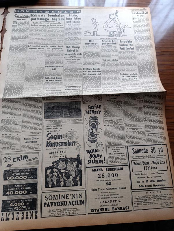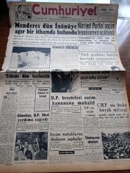 Cumhuriyet Gazetesi - 19 Ekim 1957 - Bir Savaşçı Yazan Nadir Nadi Köşe Yazısı - Adnan Menderes Dün İsmet İnönü'ye Ağır Bir İthamda Bulundu - Üstad Hüseyin Cahit Yalçın'ı Dün Kaybettik Fotoğraf - Şemsettin Günaltay Demokrat Partilileri Yardıma Çağırdı - Hürriyet Partisi Seçim Beyannamesi Açıklandı - Türk Uçakları Suriye Üzerinde Uçmamıştır - Cumhurbaşkanı Neden Seçim Nutku Söylüyor - Cumhuriyetçi Millet Partisi'nin Dünkü Büyük Mitingi - Türkiye'nin Altınları - 20 Liraya Bir Yahudi Nakleden M. Kenan Kan Yazı Dizisi - İblisin Kızı Yazan Guy Des Cars Yazı Dizisi - Abdurrahman Gazi Garnizonunun Temeli Dün Atıldı - Kıbrıs'ta Bombalar Patlamaya Başladı - Burhan Felek Köşe Yazısı - Ankara'da Asya Gribi Şiddetlendi - Asya Gribine Yakalanan Hürriyet Partisi Liderleri - Dünkü İlk Antremanda Yalçın Granit Milli Takımdan Affını İstedi - Ankara Kapalı Spor Sarayı Açılıyor adlı eser, Kitap > Süreli Yayınlar > Gazeteler > Türkiye > Genel > Günlük kategorisinde İkinci El olarak satıştadır.