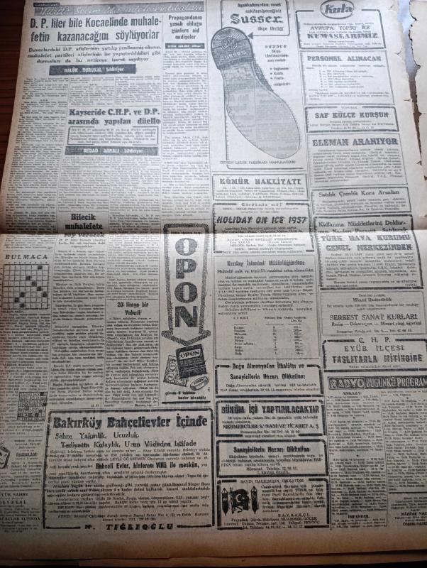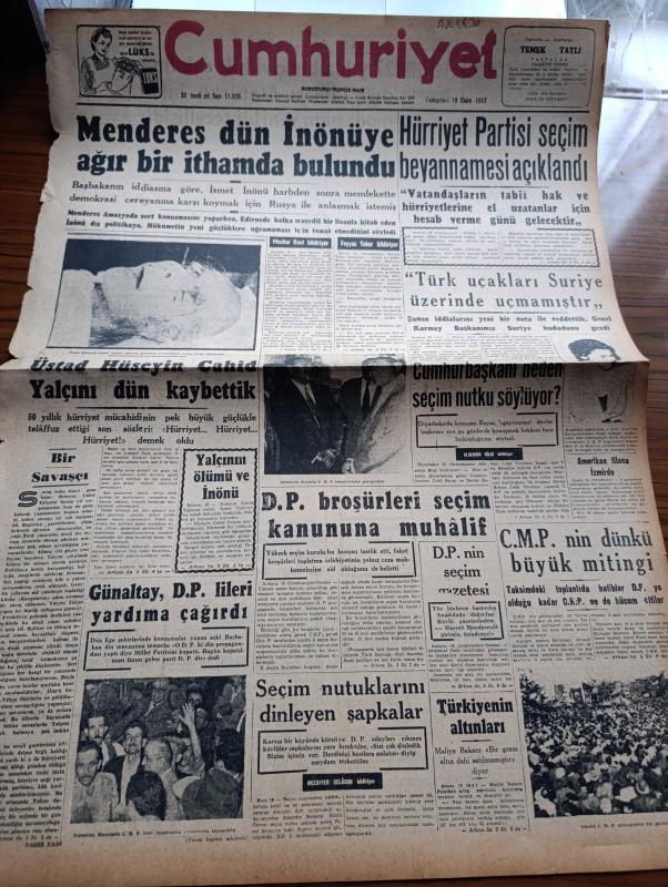 Cumhuriyet Gazetesi - 19 Ekim 1957 - Bir Savaşçı Yazan Nadir Nadi Köşe Yazısı - Adnan Menderes Dün İsmet İnönü'ye Ağır Bir İthamda Bulundu - Üstad Hüseyin Cahit Yalçın'ı Dün Kaybettik Fotoğraf - Şemsettin Günaltay Demokrat Partilileri Yardıma Çağırdı - Hürriyet Partisi Seçim Beyannamesi Açıklandı - Türk Uçakları Suriye Üzerinde Uçmamıştır - Cumhurbaşkanı Neden Seçim Nutku Söylüyor - Cumhuriyetçi Millet Partisi'nin Dünkü Büyük Mitingi - Türkiye'nin Altınları - 20 Liraya Bir Yahudi Nakleden M. Kenan Kan Yazı Dizisi - İblisin Kızı Yazan Guy Des Cars Yazı Dizisi - Abdurrahman Gazi Garnizonunun Temeli Dün Atıldı - Kıbrıs'ta Bombalar Patlamaya Başladı - Burhan Felek Köşe Yazısı - Ankara'da Asya Gribi Şiddetlendi - Asya Gribine Yakalanan Hürriyet Partisi Liderleri - Dünkü İlk Antremanda Yalçın Granit Milli Takımdan Affını İstedi - Ankara Kapalı Spor Sarayı Açılıyor, Yunus Nadi tarafından kaleme alınmıştır. Cumhuriyet Gazetesi - 19 Ekim 1957 - Bir Savaşçı Yazan Nadir Nadi Köşe Yazısı - Adnan Menderes Dün İsmet İnönü'ye Ağır Bir İthamda Bulundu - Üstad Hüseyin Cahit Yalçın'ı Dün Kaybettik Fotoğraf - Şemsettin Günaltay Demokrat Partilileri Yardıma Çağırdı - Hürriyet Partisi Seçim Beyannamesi Açıklandı - Türk Uçakları Suriye Üzerinde Uçmamıştır - Cumhurbaşkanı Neden Seçim Nutku Söylüyor - Cumhuriyetçi Millet Partisi'nin Dünkü Büyük Mitingi - Türkiye'nin Altınları - 20 Liraya Bir Yahudi Nakleden M. Kenan Kan Yazı Dizisi - İblisin Kızı Yazan Guy Des Cars Yazı Dizisi - Abdurrahman Gazi Garnizonunun Temeli Dün Atıldı - Kıbrıs'ta Bombalar Patlamaya Başladı - Burhan Felek Köşe Yazısı - Ankara'da Asya Gribi Şiddetlendi - Asya Gribine Yakalanan Hürriyet Partisi Liderleri - Dünkü İlk Antremanda Yalçın Granit Milli Takımdan Affını İstedi - Ankara Kapalı Spor Sarayı Açılıyor adlı eser Türkçe dilindedir.