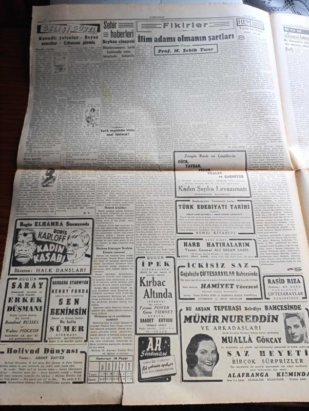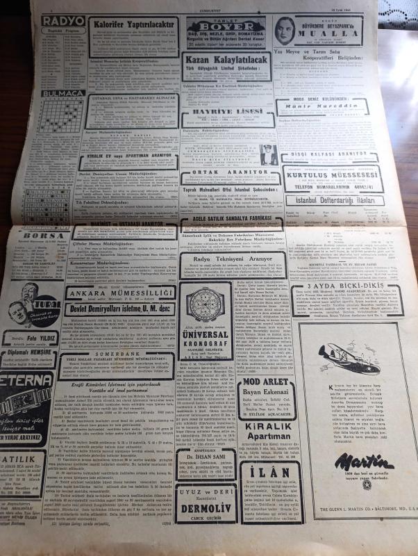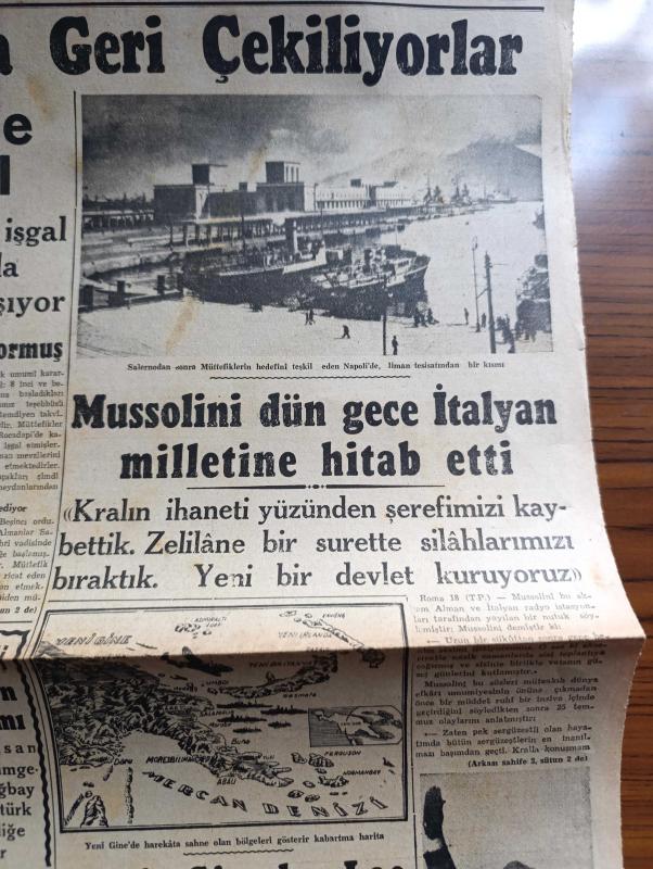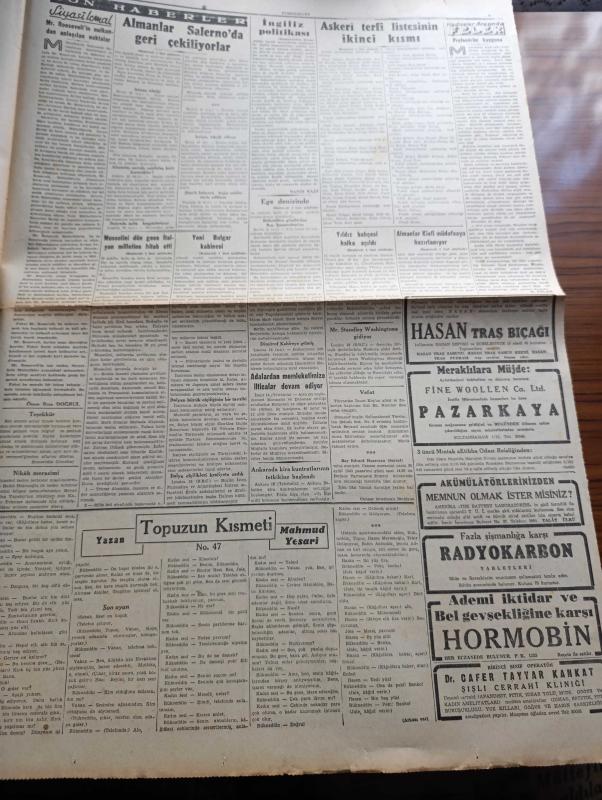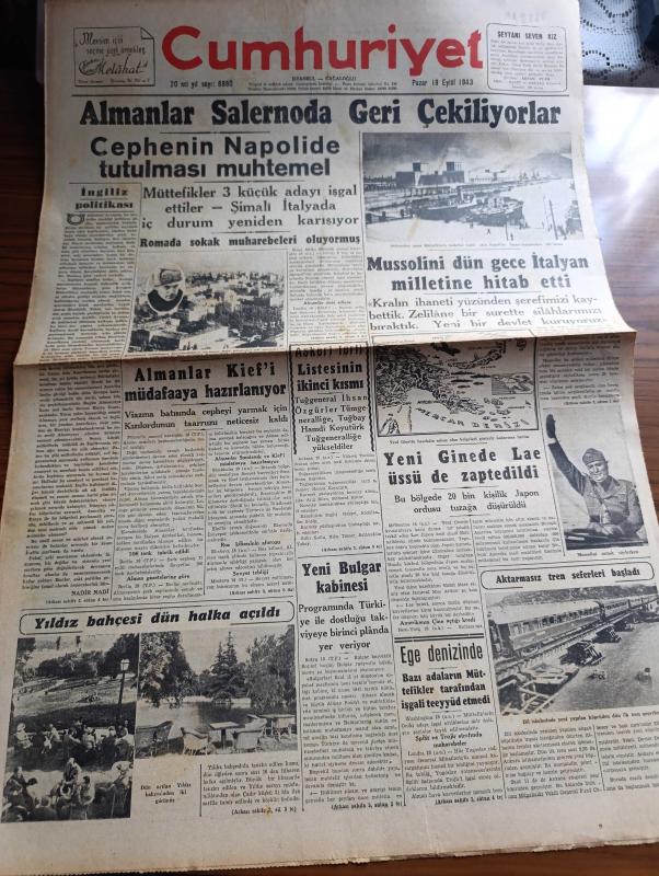Cumhuriyet Gazetesi - 19 Eylül 1943 - İngiliz politikası yazan Nadir Nadi Başmakale - Almanlar Salernoda geri çekiliyorlar - müttefikler üç küçük adayı işgal ettiler - şimali İtalya'da iç durum yeniden karışıyor - Mussolini dün gece İtalyan milletine hitap etti fotoğraf - yeni gine'de harekata sahne olan bölgeleri gösterir kabartma harita - yeni gine'de lae üssü de zapt edildi - Almanlar Kief'i müdafaaya hazırlanıyor - Yıldız bahçesi dün halka açıldı fotoğraf - Dil iskelesinde yeni yapılan köprüden dün İlk tren geçerken fotoğraf - varlık vergisinden kimler muaf tutulacak - merhum kimyager İbrahim ethem'in cenazesi - Münir Nurettin Selçuk ve Mualla Gökçay Tepebaşı belediye bahçesinde - erkek düşmanı filmi bugün Saray sinemasında - topuzun kısmeti yazan Mahmut Yesari yazı dizisi - birinci sınıf operatör Doktor Cafer Tayyar Kankat - Hayriye Lisesi kayıt ilanı - Raşit Rıza tiyatrosu çemberlitaş sinemasında - Eterna İsveç saati - Universal kronograf saatleri gelmiştir arlon saat mağazası adlı eser, Kitap > Süreli Yayınlar > Gazeteler > Türkiye > Genel > Günlük kategorisinde İkinci El olarak satıştadır.