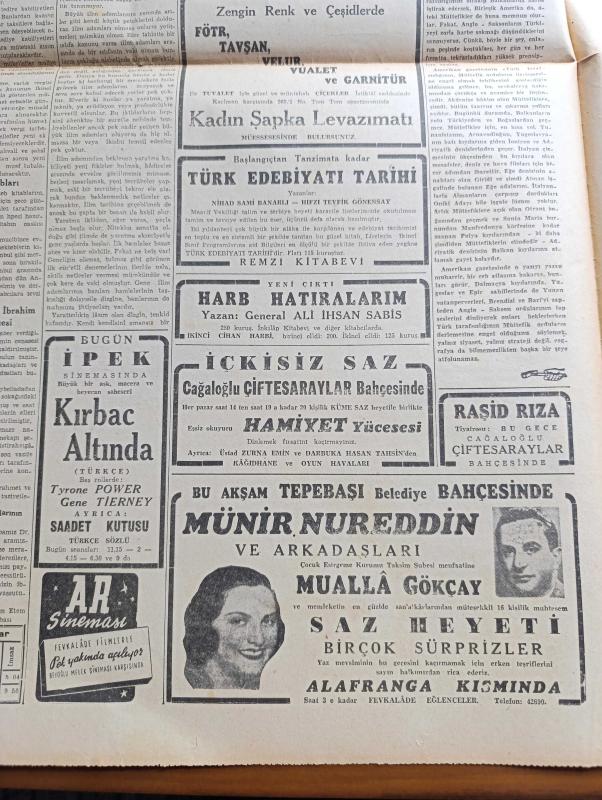 Cumhuriyet Gazetesi - 19 Eylül 1943 - İngiliz politikası yazan Nadir Nadi Başmakale - Almanlar Salernoda geri çekiliyorlar - müttefikler üç küçük adayı işgal ettiler - şimali İtalya'da iç durum yeniden karışıyor - Mussolini dün gece İtalyan milletine hitap etti fotoğraf - yeni gine'de harekata sahne olan bölgeleri gösterir kabartma harita - yeni gine'de lae üssü de zapt edildi - Almanlar Kief'i müdafaaya hazırlanıyor - Yıldız bahçesi dün halka açıldı fotoğraf - Dil iskelesinde yeni yapılan köprüden dün İlk tren geçerken fotoğraf - varlık vergisinden kimler muaf tutulacak - merhum kimyager İbrahim ethem'in cenazesi - Münir Nurettin Selçuk ve Mualla Gökçay Tepebaşı belediye bahçesinde - erkek düşmanı filmi bugün Saray sinemasında - topuzun kısmeti yazan Mahmut Yesari yazı dizisi - birinci sınıf operatör Doktor Cafer Tayyar Kankat - Hayriye Lisesi kayıt ilanı - Raşit Rıza tiyatrosu çemberlitaş sinemasında - Eterna İsveç saati - Universal kronograf saatleri gelmiştir arlon saat mağazası, Yunus Nadi tarafından kaleme alınmıştır. Cumhuriyet Gazetesi - 19 Eylül 1943 - İngiliz politikası yazan Nadir Nadi Başmakale - Almanlar Salernoda geri çekiliyorlar - müttefikler üç küçük adayı işgal ettiler - şimali İtalya'da iç durum yeniden karışıyor - Mussolini dün gece İtalyan milletine hitap etti fotoğraf - yeni gine'de harekata sahne olan bölgeleri gösterir kabartma harita - yeni gine'de lae üssü de zapt edildi - Almanlar Kief'i müdafaaya hazırlanıyor - Yıldız bahçesi dün halka açıldı fotoğraf - Dil iskelesinde yeni yapılan köprüden dün İlk tren geçerken fotoğraf - varlık vergisinden kimler muaf tutulacak - merhum kimyager İbrahim ethem'in cenazesi - Münir Nurettin Selçuk ve Mualla Gökçay Tepebaşı belediye bahçesinde - erkek düşmanı filmi bugün Saray sinemasında - topuzun kısmeti yazan Mahmut Yesari yazı dizisi - birinci sınıf operatör Doktor Cafer Tayyar Kankat - Hayriye Lisesi kayıt ilanı - Raşit Rıza tiyatrosu çemberlitaş sinemasında - Eterna İsveç saati - Universal kronograf saatleri gelmiştir arlon saat mağazası adlı eser Türkçe dilindedir.
