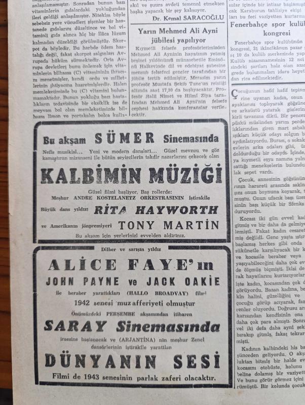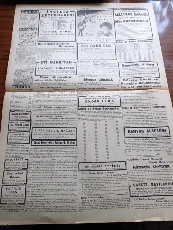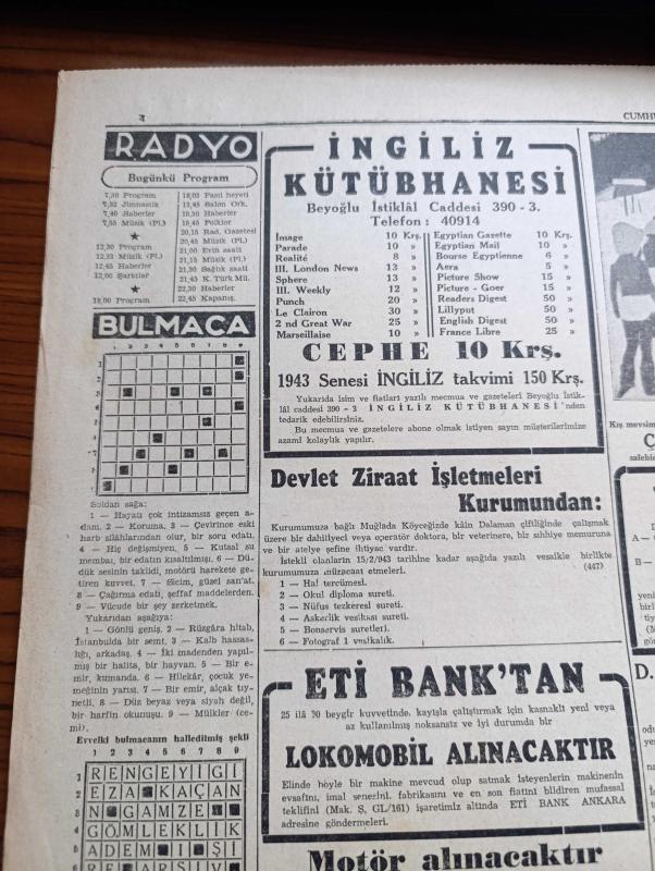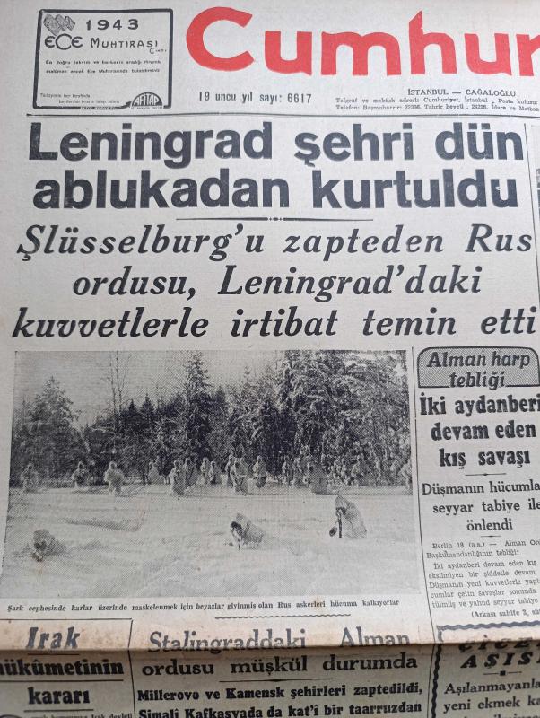 Cumhuriyet Gazetesi - 19 İkincikanun (Ocak) 1943 - Irak Hükümetinin Kararı Cumhuriyet Başmakale - Leningrad Şehri Dün Ablukadan Kurtuldu - Şark Cephesinde Karlar Üzerinde Beyazlar Giyinmiş Rus Askerleri Hücuma Kalkıyor Fotoğrafı - Alman Harp Tebliği - Alman Tayyareleri Şiddetli Hücumlarından Sonra Harap Olan Londra Mahalleleri Fotoğraf - İnönü Ansiklopedisi - Çiçek Aşısı Aşılanmayanlara Yeni Ekmek Karnesi Verilmeyecek - Askeri Vaziyet 5. Rus Taarruzunun Muhtemel Neticeleri Yazan Emekli General H. Emir Erkilet Yazı Dizisi - Hükümetin Mühim Kararı Buğday Her Yerde Serbest Olarak Satılacak - 8. Ordu Trablusa Doğru İlerliyor - Tıbbi Tetkikler Harp Ve Hastalıklar Yazan Doktor Kemal Saraçoğlu - Kıymetli Felsefe Profesörü Mehmet Ali Ayni Jübilesi Yapılıyor - Kalbimin Müziği Filmi Başrolde Rita Hayworth Ve Tony Martin Bu Akşam Sümer Sinemasında - Fenerbahçe Spor Kulübünün Kongresi - Varlık Vergisi Vermemek İçin Hataya Kaçan Musevi Yakalanarak Ankara'ya Getirildi - İstanbul Belediyesi Tiyatro, Yunus Nadi tarafından kaleme alınmıştır. Cumhuriyet Gazetesi - 19 İkincikanun (Ocak) 1943 - Irak Hükümetinin Kararı Cumhuriyet Başmakale - Leningrad Şehri Dün Ablukadan Kurtuldu - Şark Cephesinde Karlar Üzerinde Beyazlar Giyinmiş Rus Askerleri Hücuma Kalkıyor Fotoğrafı - Alman Harp Tebliği - Alman Tayyareleri Şiddetli Hücumlarından Sonra Harap Olan Londra Mahalleleri Fotoğraf - İnönü Ansiklopedisi - Çiçek Aşısı Aşılanmayanlara Yeni Ekmek Karnesi Verilmeyecek - Askeri Vaziyet 5. Rus Taarruzunun Muhtemel Neticeleri Yazan Emekli General H. Emir Erkilet Yazı Dizisi - Hükümetin Mühim Kararı Buğday Her Yerde Serbest Olarak Satılacak - 8. Ordu Trablusa Doğru İlerliyor - Tıbbi Tetkikler Harp Ve Hastalıklar Yazan Doktor Kemal Saraçoğlu - Kıymetli Felsefe Profesörü Mehmet Ali Ayni Jübilesi Yapılıyor - Kalbimin Müziği Filmi Başrolde Rita Hayworth Ve Tony Martin Bu Akşam Sümer Sinemasında - Fenerbahçe Spor Kulübünün Kongresi - Varlık Vergisi Vermemek İçin Hataya Kaçan Musevi Yakalanarak Ankara'ya Getirildi - İstanbul Belediyesi Tiyatro adlı eser Türkçe dilindedir.