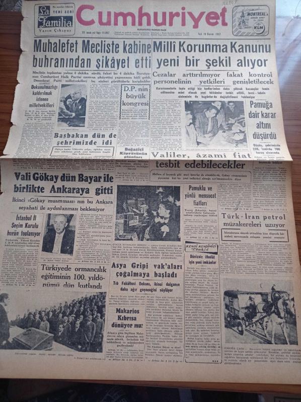 Cumhuriyet Gazetesi - 19 Kasım 1957 - Muhalefet Mecliste Kabine Buhranından Şikayet Etti - Vali Fahrettin Kerim Gökay Dün Celal Bayar İle Birlikte Ankara'ya Gitti - Milli Korunma Kanunu Yeni Bir Şekil Alıyor - Boğaziçi Köprüsünün Planları - İstanbul İl Seçim Kurulu Bugün Toplanıyor - Asya Gribi Vakaları Çoğalmaya Başladı - Türk İran Petrol Müzakereleri Uzuyor - Başbakan Adnan Menderes - Doktor Orhan Yamanlar - Fezanın İlk Tarihleri Suni Peykler Yazı Dizisi - Seni Sevmek Kaderim Yazan Sinclair Levis - Tango Bestekarı Necib Celal Hasta - Burhan Felek - Çocuk Kitapları Sergileri - Telepati - Makarios Kıbrıs'a Dönüyor Mu - Fenerbahçeli Ergun Öztuna Yurtdışından Geliyor - Milli Futbol Takımı Dün Akşam İlan Edildi - Türkiye Boks Şampiyonası Yeni Bir Şekilde Yapılacak - Güreş Federasyonu Reisi Cenab Berksoy'un Dünkü Toplantısı - Nivea Krem adlı eser, Kitap > Süreli Yayınlar > Gazeteler > Türkiye > Genel > Günlük kategorisinde İkinci El olarak satıştadır.
