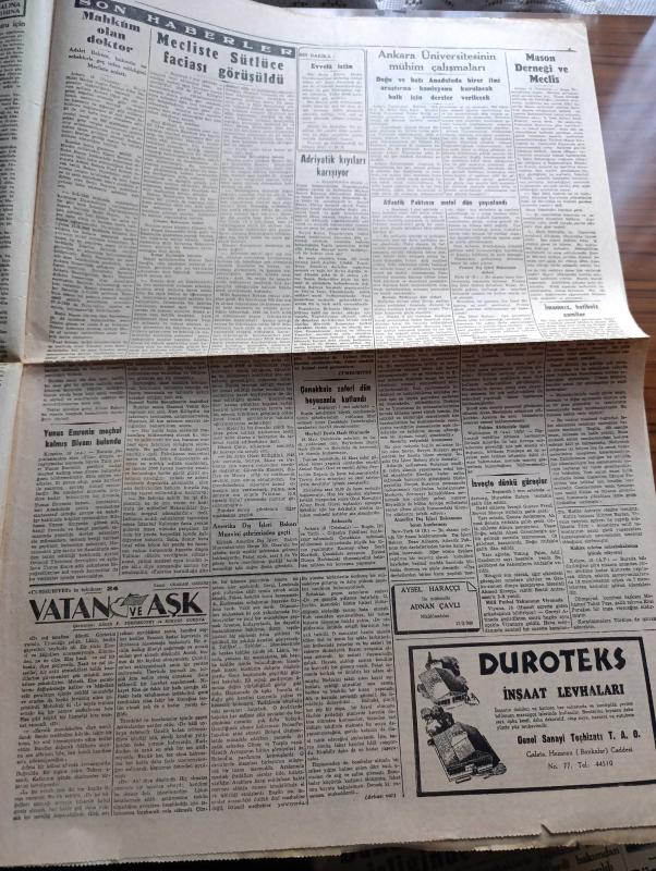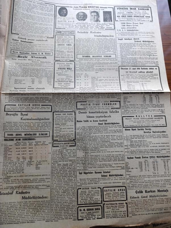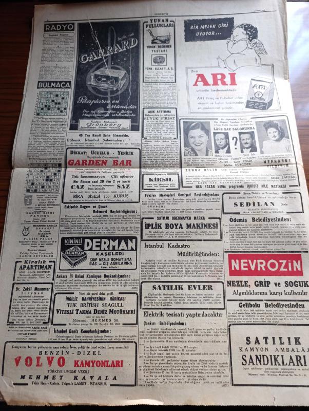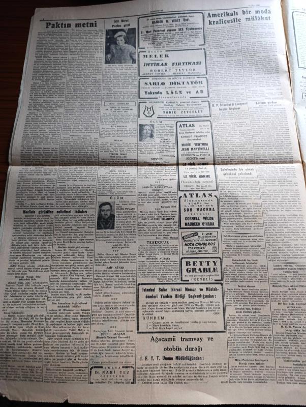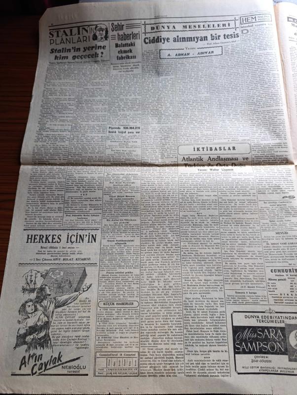 Cumhuriyet Gazetesi - 19 Mart 1949 - adriyatik kıyıları karışıyor Cumhuriyet Başmakale - Atlantik Paktının metni dün yayınlandı - Bevin nutkunda bizim vaziyetimizden bahsetti - Atlantik Paktına giren devletleri gösterir harita - İstanbul'da bir casus şebekesi yakalandı - sovyetlerin Atlantik Paktına karşı tedbirleri - heybeli Deniz Harp okulu'ndaki törende harita önünde izahat fotoğraf - Amerikalı moda kraliçesi Tena Leser ile mülakat - Doktor Milton dün Amerikan haberler bürosunda kör bir Türk gencine kabartma bir kitap okutuyor fotoğraf - Stalin'in Planları yazan İngiltere'ye sığınan Sovyet yarbayı Gregoriy Tokayev - Balat'taki Ekmek fabrikası - Yunus Emre'nin meçhul kalmış divanı bulundu - mason derneği ve meclis - Şarlo Diktatör yakında Lale ve ar sinemasında - İdil biret Paris'e gitti fotoğraf - Safiye Ayla Necati Tokyay her akşam Taksim kristal salonunda - Zehra Bilir Hakkı Derman Şerif İçli Mefharet Yıldırım Lale saz salonunda - bugünkü radyo programı - arı unları -Volvo kamyon, Yunus Nadi tarafından kaleme alınmıştır. Cumhuriyet Gazetesi - 19 Mart 1949 - adriyatik kıyıları karışıyor Cumhuriyet Başmakale - Atlantik Paktının metni dün yayınlandı - Bevin nutkunda bizim vaziyetimizden bahsetti - Atlantik Paktına giren devletleri gösterir harita - İstanbul'da bir casus şebekesi yakalandı - sovyetlerin Atlantik Paktına karşı tedbirleri - heybeli Deniz Harp okulu'ndaki törende harita önünde izahat fotoğraf - Amerikalı moda kraliçesi Tena Leser ile mülakat - Doktor Milton dün Amerikan haberler bürosunda kör bir Türk gencine kabartma bir kitap okutuyor fotoğraf - Stalin'in Planları yazan İngiltere'ye sığınan Sovyet yarbayı Gregoriy Tokayev - Balat'taki Ekmek fabrikası - Yunus Emre'nin meçhul kalmış divanı bulundu - mason derneği ve meclis - Şarlo Diktatör yakında Lale ve ar sinemasında - İdil biret Paris'e gitti fotoğraf - Safiye Ayla Necati Tokyay her akşam Taksim kristal salonunda - Zehra Bilir Hakkı Derman Şerif İçli Mefharet Yıldırım Lale saz salonunda - bugünkü radyo programı - arı unları -Volvo kamyon adlı eser Türkçe dilindedir.