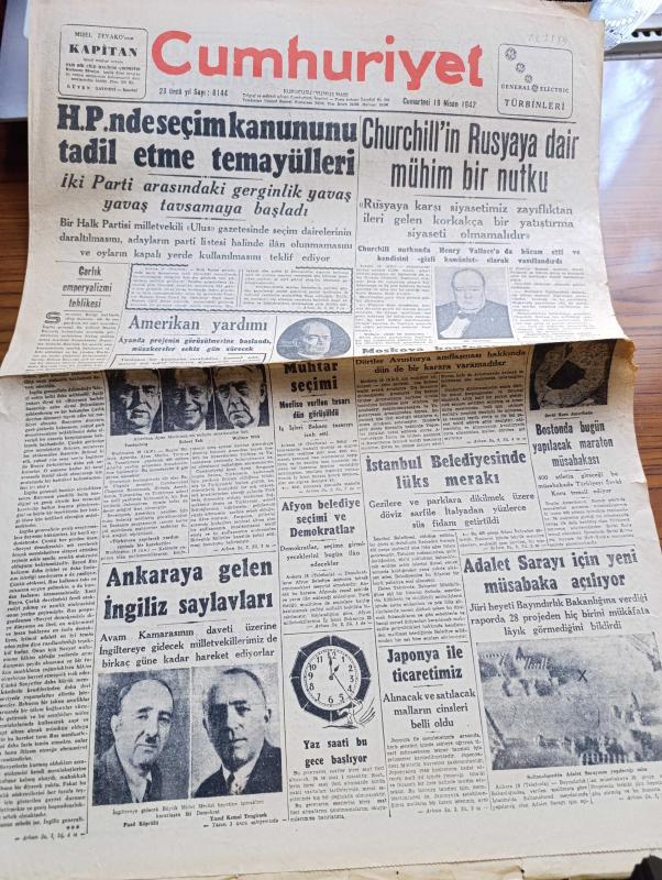 Cumhuriyet Gazetesi - 19 Nisan 1947 - Çarlık Emperyalizmi Tehlikesi Köşe Yazısı - Halk Partisinde Seçim Kanununu Tadil Etme Temayülleri - Churchill'in Rusya'ya Dair Mühim Bir Nutku - Amerikan Yardımı Ayanda Projenin Görüşülmesine Başlandı - Ankara'ya Gelen İngiliz Saylavları - Fuat Köprülü Ve Yusuf Kemal Tengirşek Fotoğraf - Muhtar Seçimi - Şevki Koru Amerika'da - Bostonda Bugün Yapılacak Maratonda Müsabakası - İstanbul Belediyesinde Lüks Merakı - Afyon Belediye Seçimi Ve Demokratlar - Adalet Sarayı İçin Müsabaka Açılıyor - Türk Güreşi Kendi Ağzından Kurdderelinin Hayatı Yazanlar İsmailoğlu Habib Sevük - Hamiyet Yüceses Ve Selahattin Pınar Taksim Kristal Salonunda - Milli Kalkınma Partisinin Kongresi Devam Ediyor - Sana Tapıyorum Üsküdar Sunar Sinemasında - Filistin Tehlikesi Yazan Ömer Rıza Doğrul Köşe Yazısı - Adak Yazan Kemal Ragıp Yazı Dizisi - Galatasaray Vefa Takımları Şeref Stadında Karşılaşıyor - Heligoland Adası Havaya Uçuruldu - Bugünkü Radyo Programı - Bulmaca adlı eser, Kitap > Süreli Yayınlar > Gazeteler > Türkiye > Genel > Günlük kategorisinde İkinci El olarak satıştadır.