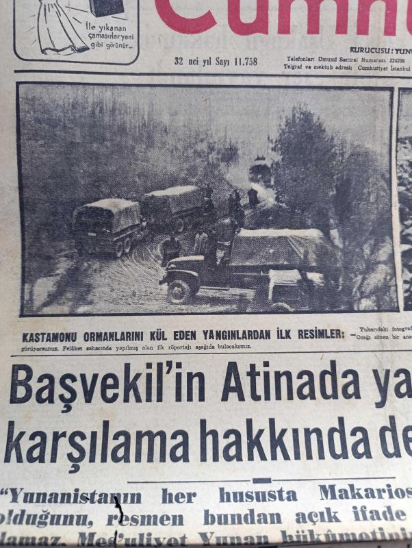 Cumhuriyet Gazetesi - 19 Nisan 1957 - Kastamonu Ormanlarını Kül Eden Yangınlardan İlk Resimler - Başvekil Adnan Menderes'in Atina'da Yapılan Karşılama Hakkında Demeci - Fatin Rüştü Zorlu İle Nuri Birgi Arasında Dikkat Çeken Görüşme - Kıbrıs Türklerinin Lideri Fazıl Küçük'e Göre Tek Mesul İngiltere'dir - Kastamonu Ormanlarında 40 Yerde Birden Çıkan Yangının Hazin Bilançosu - Akis Dergisi Aleyhine Açılan 3 Davaya Dün Bakıldı - Halid Ziya Uşaklıgil Hakkında Rusça Bir Eser Yayınlandı Yazan Hasan Ali Ediz - 50 Yıl Evvelki Kuleliden Hatıralar Yazan Hasan Amca Yazı Dizisi - Kırkıncı Oda Yazan Peride Celal Yazı Dizisi - İngiliz Bütçesinin Hünerleri Yazan Burhan Felek Köşe Yazısı - Süveyşten İlk Türk Gemisi Dün Geçti - Türk Amerikan Hukukçuların Kongresi Bitti - Radyo Bugünkü Program- Krem Pertev - Genç Milli Takımımız İtalya İle Berabere Kaldı - Dünya Atış Şampiyonası İçin Said Salahaddin Cihanoğlu Londra'ya Davet Olundu - Beşiktaş Kulübü Meşaroş'un Mukavelesi Yenilemiyor, Yunus Nadi tarafından kaleme alınmıştır. Cumhuriyet Gazetesi - 19 Nisan 1957 - Kastamonu Ormanlarını Kül Eden Yangınlardan İlk Resimler - Başvekil Adnan Menderes'in Atina'da Yapılan Karşılama Hakkında Demeci - Fatin Rüştü Zorlu İle Nuri Birgi Arasında Dikkat Çeken Görüşme - Kıbrıs Türklerinin Lideri Fazıl Küçük'e Göre Tek Mesul İngiltere'dir - Kastamonu Ormanlarında 40 Yerde Birden Çıkan Yangının Hazin Bilançosu - Akis Dergisi Aleyhine Açılan 3 Davaya Dün Bakıldı - Halid Ziya Uşaklıgil Hakkında Rusça Bir Eser Yayınlandı Yazan Hasan Ali Ediz - 50 Yıl Evvelki Kuleliden Hatıralar Yazan Hasan Amca Yazı Dizisi - Kırkıncı Oda Yazan Peride Celal Yazı Dizisi - İngiliz Bütçesinin Hünerleri Yazan Burhan Felek Köşe Yazısı - Süveyşten İlk Türk Gemisi Dün Geçti - Türk Amerikan Hukukçuların Kongresi Bitti - Radyo Bugünkü Program- Krem Pertev - Genç Milli Takımımız İtalya İle Berabere Kaldı - Dünya Atış Şampiyonası İçin Said Salahaddin Cihanoğlu Londra'ya Davet Olundu - Beşiktaş Kulübü Meşaroş'un Mukavelesi Yenilemiyor adlı eser Türkçe dilindedir.