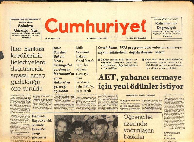 Cumhuriyet Gazetesi 19 Nisan 1975 - AET, Yabancı Sermaye İçin Yeni Ödünler İstiyor - 3 Milyon Liralık Kaçak Silah Ve Mermi Ele Geçirildi! GZ143476, en son 23 gün önce güncellenmiştir.
