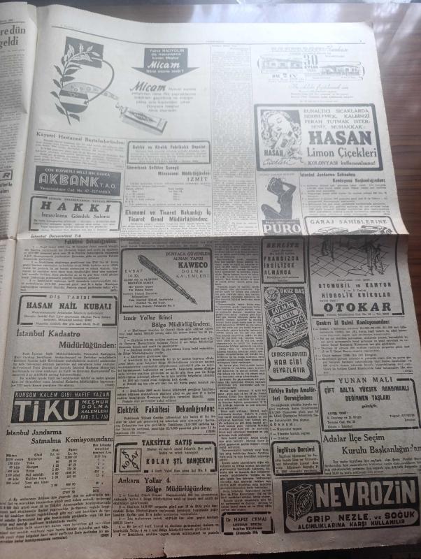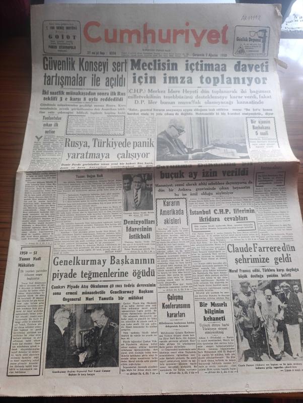 Cumhuriyet Gazetesi - 2 Ağustos 1950 - toplantıdan çıkan ilk netice Cumhuriyet Başmakale - güvenlik Konseyi sert tartışmalar ile açıldı - meclisin içtimaa daveti için imza toplanıyor - Milli Savunma Bakanı Refik Şevket İnceye bir buçuk ay izin verildi - Rusya Türkiye'de panik yaratmaya çalışıyor - Genelkurmay Başkanı Orgeneral Nuri Yamut'un piyade teğmenlerine öğüdü fotoğraf - maruf Fransız edibi Claude Farrere dün İstanbul'a geldi fotoğraf - bir mısırlı kahinin kehaneti üçüncü Dünya harbi Türkiye'ye sirayet etmeyecekmiş - bir ajansın Başbakan Adnan Menderes'e 5 suali - 3. Dünya harbi nasıl olacak yazan İngiliz gizli istihbarat subaylarından Philipp Reynoids yazı dizisi - Ankara vapuru dün geldi - Posta güvercini yazan Kerime Nadir yazı dizisi - Türkiye güzellik kraliçesi müsabakası Beyhan Katuk Ve Asuman Demireli fotoğraf - düdüğümüz ötmez oldu yazan Burhan Felek - Stalin yeniden dil bilgini rolünde - Bursa Valisi Haşim İşcan Bursa'dan ayrıldı - Üç Silahşörler yazan Alexandre Dumas, Yunus Nadi tarafından kaleme alınmıştır. Cumhuriyet Gazetesi - 2 Ağustos 1950 - toplantıdan çıkan ilk netice Cumhuriyet Başmakale - güvenlik Konseyi sert tartışmalar ile açıldı - meclisin içtimaa daveti için imza toplanıyor - Milli Savunma Bakanı Refik Şevket İnceye bir buçuk ay izin verildi - Rusya Türkiye'de panik yaratmaya çalışıyor - Genelkurmay Başkanı Orgeneral Nuri Yamut'un piyade teğmenlerine öğüdü fotoğraf - maruf Fransız edibi Claude Farrere dün İstanbul'a geldi fotoğraf - bir mısırlı kahinin kehaneti üçüncü Dünya harbi Türkiye'ye sirayet etmeyecekmiş - bir ajansın Başbakan Adnan Menderes'e 5 suali - 3. Dünya harbi nasıl olacak yazan İngiliz gizli istihbarat subaylarından Philipp Reynoids yazı dizisi - Ankara vapuru dün geldi - Posta güvercini yazan Kerime Nadir yazı dizisi - Türkiye güzellik kraliçesi müsabakası Beyhan Katuk Ve Asuman Demireli fotoğraf - düdüğümüz ötmez oldu yazan Burhan Felek - Stalin yeniden dil bilgini rolünde - Bursa Valisi Haşim İşcan Bursa'dan ayrıldı - Üç Silahşörler yazan Alexandre Dumas adlı eser Türkçe dilindedir.