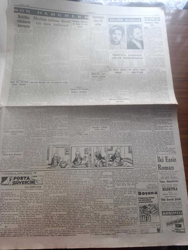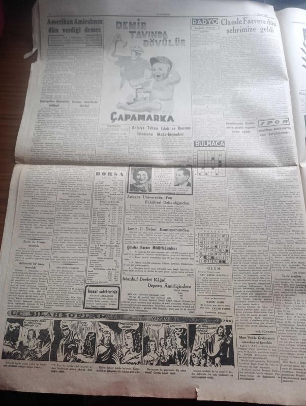 Cumhuriyet Gazetesi - 2 Ağustos 1950 - toplantıdan çıkan ilk netice Cumhuriyet Başmakale - güvenlik Konseyi sert tartışmalar ile açıldı - meclisin içtimaa daveti için imza toplanıyor - Milli Savunma Bakanı Refik Şevket İnceye bir buçuk ay izin verildi - Rusya Türkiye'de panik yaratmaya çalışıyor - Genelkurmay Başkanı Orgeneral Nuri Yamut'un piyade teğmenlerine öğüdü fotoğraf - maruf Fransız edibi Claude Farrere dün İstanbul'a geldi fotoğraf - bir mısırlı kahinin kehaneti üçüncü Dünya harbi Türkiye'ye sirayet etmeyecekmiş - bir ajansın Başbakan Adnan Menderes'e 5 suali - 3. Dünya harbi nasıl olacak yazan İngiliz gizli istihbarat subaylarından Philipp Reynoids yazı dizisi - Ankara vapuru dün geldi - Posta güvercini yazan Kerime Nadir yazı dizisi - Türkiye güzellik kraliçesi müsabakası Beyhan Katuk Ve Asuman Demireli fotoğraf - düdüğümüz ötmez oldu yazan Burhan Felek - Stalin yeniden dil bilgini rolünde - Bursa Valisi Haşim İşcan Bursa'dan ayrıldı - Üç Silahşörler yazan Alexandre Dumas adlı eser, Kitap > Süreli Yayınlar > Gazeteler > Türkiye > Genel > Günlük kategorisinde İkinci El olarak satıştadır.