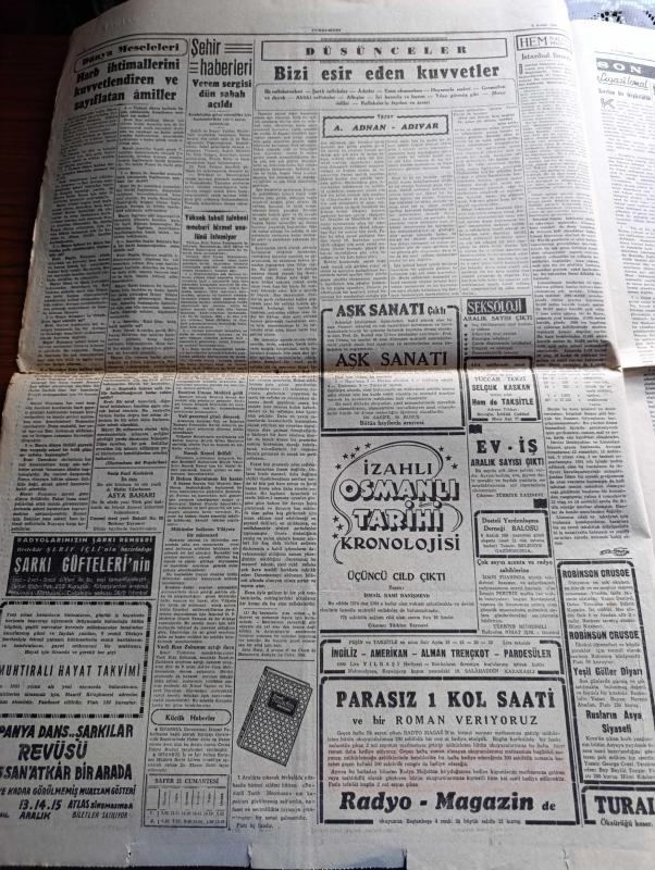 Cumhuriyet Gazetesi - 2 Aralık 1950 - biterken yazan Nadir Nadi Başmakale - Kore'de birliğimizin gösterdiği kahramanlık bütün dünyada heyecan yarattı - Kore'de birliğimizin savaştığı Changchon nehri ve dolayları - 10.000 düşmana karşı 2000 Türk'ün mucizesi - Avrupa'da birliğimize hayranlık - Kore harbi zayiatı - verem sergisi dün sabah açıldı - sanatkar Vasfi Rıza Zobu'nun açtığı dava - Karanlık Oda Yazan Peride Celal Yazı Dizisi - tramvaylar kalkabilir mi yazdan Burhan Felek - Kızılay başkanlığına Doktor Nihat Reşat Belger seçildi - İstanbul'a gelecek İspanyol Revüsü - eşsiz sanatkar Hamiyet Yüceses Taksim kristal salonunda - Muammer Karaca tiyatrosu Belami maksim'de - Kore'den fotoğraflar - Yaşar Doğu'nun bu gece yapılacak Güneş müsabakalarına iştirak edememesi muhtemel - 1950-1951 Yunus Nadi mükafatı Milli mücadele'ye ait bir hatıra - Morina Balıkyağı Taksim Eczanesinde - Emlak Bankası - Land Rover geldi - İsviçre marvin kol ve cep saatleri gelmiştir - Attle Truman Görüşmesi, Yunus Nadi tarafından kaleme alınmıştır. Cumhuriyet Gazetesi - 2 Aralık 1950 - biterken yazan Nadir Nadi Başmakale - Kore'de birliğimizin gösterdiği kahramanlık bütün dünyada heyecan yarattı - Kore'de birliğimizin savaştığı Changchon nehri ve dolayları - 10.000 düşmana karşı 2000 Türk'ün mucizesi - Avrupa'da birliğimize hayranlık - Kore harbi zayiatı - verem sergisi dün sabah açıldı - sanatkar Vasfi Rıza Zobu'nun açtığı dava - Karanlık Oda Yazan Peride Celal Yazı Dizisi - tramvaylar kalkabilir mi yazdan Burhan Felek - Kızılay başkanlığına Doktor Nihat Reşat Belger seçildi - İstanbul'a gelecek İspanyol Revüsü - eşsiz sanatkar Hamiyet Yüceses Taksim kristal salonunda - Muammer Karaca tiyatrosu Belami maksim'de - Kore'den fotoğraflar - Yaşar Doğu'nun bu gece yapılacak Güneş müsabakalarına iştirak edememesi muhtemel - 1950-1951 Yunus Nadi mükafatı Milli mücadele'ye ait bir hatıra - Morina Balıkyağı Taksim Eczanesinde - Emlak Bankası - Land Rover geldi - İsviçre marvin kol ve cep saatleri gelmiştir - Attle Truman Görüşmesi adlı eser Türkçe dilindedir.