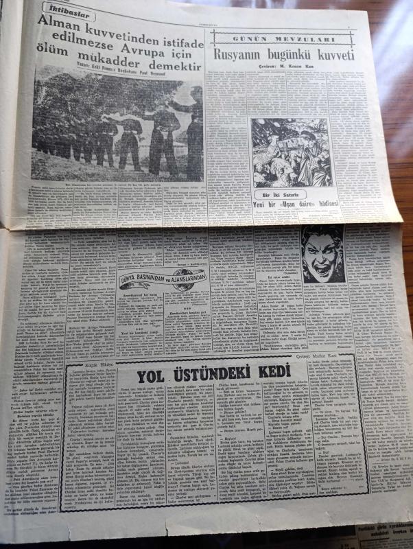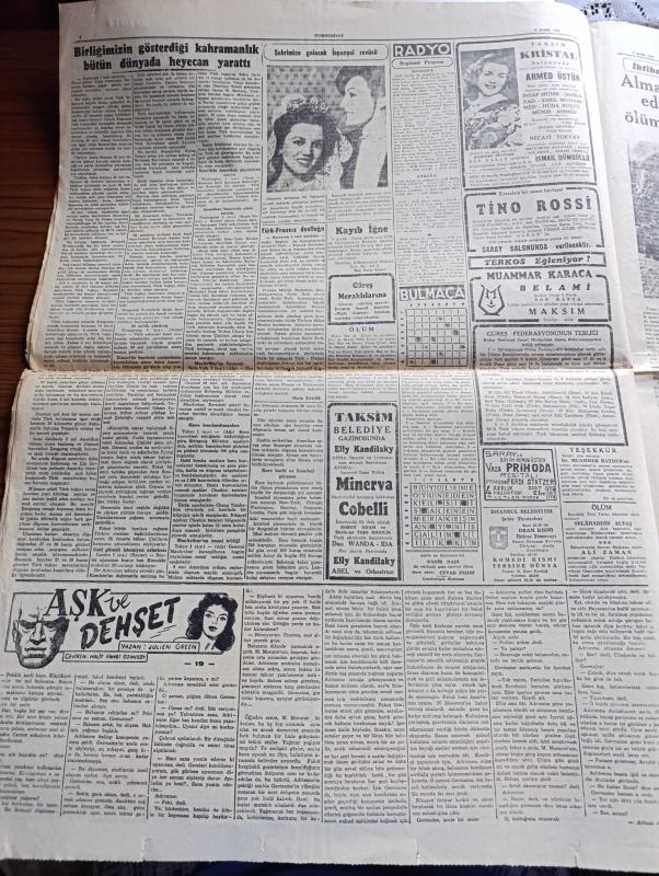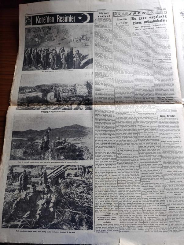Cumhuriyet Gazetesi - 2 Aralık 1950 - biterken yazan Nadir Nadi Başmakale - Kore'de birliğimizin gösterdiği kahramanlık bütün dünyada heyecan yarattı - Kore'de birliğimizin savaştığı Changchon nehri ve dolayları - 10.000 düşmana karşı 2000 Türk'ün mucizesi - Avrupa'da birliğimize hayranlık - Kore harbi zayiatı - verem sergisi dün sabah açıldı - sanatkar Vasfi Rıza Zobu'nun açtığı dava - Karanlık Oda Yazan Peride Celal Yazı Dizisi - tramvaylar kalkabilir mi yazdan Burhan Felek - Kızılay başkanlığına Doktor Nihat Reşat Belger seçildi - İstanbul'a gelecek İspanyol Revüsü - eşsiz sanatkar Hamiyet Yüceses Taksim kristal salonunda - Muammer Karaca tiyatrosu Belami maksim'de - Kore'den fotoğraflar - Yaşar Doğu'nun bu gece yapılacak Güneş müsabakalarına iştirak edememesi muhtemel - 1950-1951 Yunus Nadi mükafatı Milli mücadele'ye ait bir hatıra - Morina Balıkyağı Taksim Eczanesinde - Emlak Bankası - Land Rover geldi - İsviçre marvin kol ve cep saatleri gelmiştir - Attle Truman Görüşmesi adlı eser, Kitap > Süreli Yayınlar > Gazeteler > Türkiye > Genel > Günlük kategorisinde İkinci El olarak satıştadır.