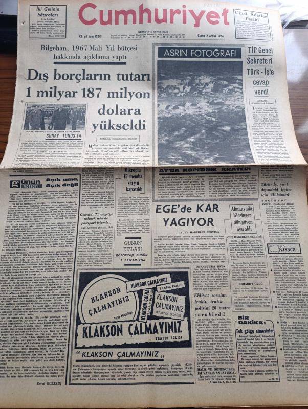 Cumhuriyet Gazetesi - 2 Aralık 1966 - Günün Notları Yazan Ecvet Güresin Köşe Yazısı - Maliye Bakanı Cihat Bilgehan 1967 Mali Yıl Bütçesi Hakkında Açıklama Yaptı - Dış Borçların Tutarı 1 Milyar 187 Milyon Dolara Yükseldi - Asrın Fotoğrafı Ayda Kopernik Krateri - TİP Genel Sekreteri Rıza Kuas Türk İş'e Cevap Verdi - Werren Tahkikatı Komisyonunun Başkan Kennedy'in Katili Olarak Nitelediği Oswald Türkiye'ye Gitmek İçin De Pasaport İstemiş - Aşırı Sağ Yazan İlhan Selçuk Köşe Yazısı - Aylak Musa Karikatür - Nimbüs Karikatür - Birleşmiş Milletler Bütün Devletlere Çağrıda Bulundu Toprak Bütünlüğü Ve Bağımsızlığa Saygı Gösterin - Mao Zedung'un Son Resimlerinden Birisi - Sınıf Arkadaşım Atatürk Yazan General Ali Fuat Cebesoy Yazı Dizisi - Dişi Bond Çizgi Roman - Garth Çizgi Roman - Tiffany Jones Çizgi Roman - Malkoçoğlu Konu Ve Resim Ayhan Başoğlu - General Motors Grubu Arabalar - 1967 Chevrolet İmpala - Chrysler Grubu Arabalar - 1967 Newport Custom - Fenerbahçe'yi 1 0 Yenen Galatasaray Şampiyon, Yunus Nadi tarafından kaleme alınmıştır. Cumhuriyet Gazetesi - 2 Aralık 1966 - Günün Notları Yazan Ecvet Güresin Köşe Yazısı - Maliye Bakanı Cihat Bilgehan 1967 Mali Yıl Bütçesi Hakkında Açıklama Yaptı - Dış Borçların Tutarı 1 Milyar 187 Milyon Dolara Yükseldi - Asrın Fotoğrafı Ayda Kopernik Krateri - TİP Genel Sekreteri Rıza Kuas Türk İş'e Cevap Verdi - Werren Tahkikatı Komisyonunun Başkan Kennedy'in Katili Olarak Nitelediği Oswald Türkiye'ye Gitmek İçin De Pasaport İstemiş - Aşırı Sağ Yazan İlhan Selçuk Köşe Yazısı - Aylak Musa Karikatür - Nimbüs Karikatür - Birleşmiş Milletler Bütün Devletlere Çağrıda Bulundu Toprak Bütünlüğü Ve Bağımsızlığa Saygı Gösterin - Mao Zedung'un Son Resimlerinden Birisi - Sınıf Arkadaşım Atatürk Yazan General Ali Fuat Cebesoy Yazı Dizisi - Dişi Bond Çizgi Roman - Garth Çizgi Roman - Tiffany Jones Çizgi Roman - Malkoçoğlu Konu Ve Resim Ayhan Başoğlu - General Motors Grubu Arabalar - 1967 Chevrolet İmpala - Chrysler Grubu Arabalar - 1967 Newport Custom - Fenerbahçe'yi 1 0 Yenen Galatasaray Şampiyon adlı eser Türkçe dilindedir.