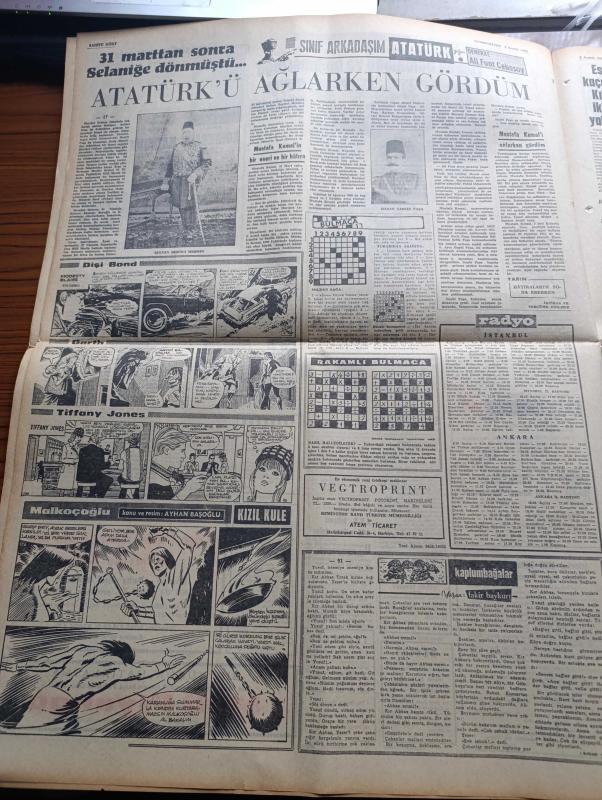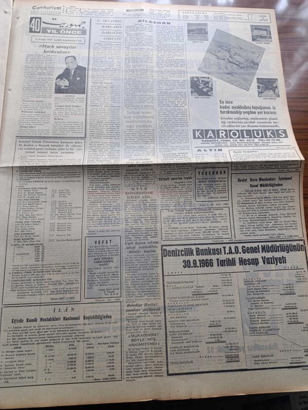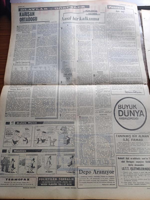 Cumhuriyet Gazetesi - 2 Aralık 1966 - Günün Notları Yazan Ecvet Güresin Köşe Yazısı - Maliye Bakanı Cihat Bilgehan 1967 Mali Yıl Bütçesi Hakkında Açıklama Yaptı - Dış Borçların Tutarı 1 Milyar 187 Milyon Dolara Yükseldi - Asrın Fotoğrafı Ayda Kopernik Krateri - TİP Genel Sekreteri Rıza Kuas Türk İş'e Cevap Verdi - Werren Tahkikatı Komisyonunun Başkan Kennedy'in Katili Olarak Nitelediği Oswald Türkiye'ye Gitmek İçin De Pasaport İstemiş - Aşırı Sağ Yazan İlhan Selçuk Köşe Yazısı - Aylak Musa Karikatür - Nimbüs Karikatür - Birleşmiş Milletler Bütün Devletlere Çağrıda Bulundu Toprak Bütünlüğü Ve Bağımsızlığa Saygı Gösterin - Mao Zedung'un Son Resimlerinden Birisi - Sınıf Arkadaşım Atatürk Yazan General Ali Fuat Cebesoy Yazı Dizisi - Dişi Bond Çizgi Roman - Garth Çizgi Roman - Tiffany Jones Çizgi Roman - Malkoçoğlu Konu Ve Resim Ayhan Başoğlu - General Motors Grubu Arabalar - 1967 Chevrolet İmpala - Chrysler Grubu Arabalar - 1967 Newport Custom - Fenerbahçe'yi 1 0 Yenen Galatasaray Şampiyon adlı eser, Kitap > Süreli Yayınlar > Gazeteler > Türkiye > Genel > Günlük kategorisinde İkinci El olarak satıştadır.