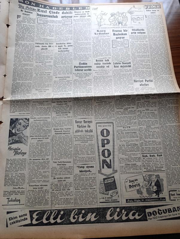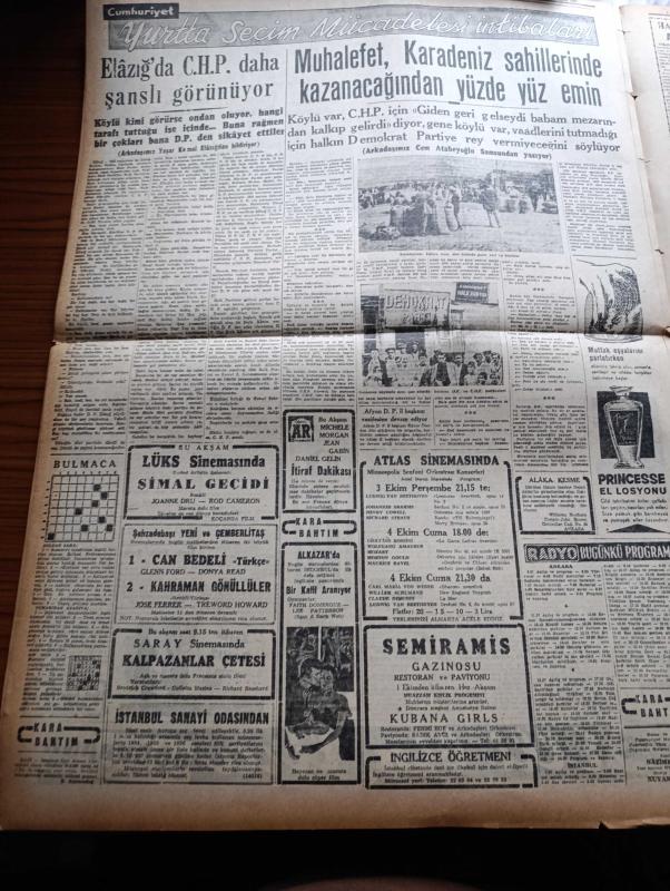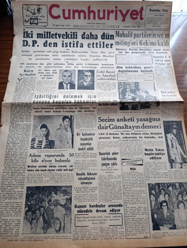Cumhuriyet Gazetesi - 2 Ekim 1957 - İki Milletvekili Dağıstan Binerbay Ve Burhaneddin Onat Demokratik Partiden İstifa Ettiler - Kara Aydınlar Yazan Nadir Nadi Köşe Yazısı - Adana Vapurunda 50 Kilo Afyon Bulundu - Muhalif Partilerin Seçim Mitingleri 6 Ekime Kaldı - Brezilya'dan 300 Ton Kahve Geliyor - Celal Bayar Ve İstanbul Milletvekilliği - Seçim Anketi Yasağına Rağmen Şemseddin Günaltay'ın Demeci - Metin Toker Bugün Tahliye Ediliyor - Kapani Kardeşler Arasında Mücadele Devam Ediyor - İblisin Kızı Yazan Guy Des Cars Yazı Dizisi - 20 Liraya Bir Yahudi Nakleden M. Kenan Kan Yazı Dizisi - Amerika'da Zencilerin Meselesi Yazan Sulhi Dönmezer - Ürdün Parlamentosu Tekrar Açıldı - Bir Şempanze Dava Açtı - Burhan Felek Köşe Yazısı - Yurtta Seçim Mücadelesi İntibaları - Atlas Sinemasında Minneapolis Senfoni Orkestrası Konserleri - Dün Bakkallara Peynir Dağıtılmaya Başlandı - Turgay Şeren Takımda Yer Almayınca Galatasaray Spartak'a 3 0 Yenildi - Şeref Has Ve Ayhan Hançeri Milli Takımda, Yunus Nadi tarafından kaleme alınmıştır. Cumhuriyet Gazetesi - 2 Ekim 1957 - İki Milletvekili Dağıstan Binerbay Ve Burhaneddin Onat Demokratik Partiden İstifa Ettiler - Kara Aydınlar Yazan Nadir Nadi Köşe Yazısı - Adana Vapurunda 50 Kilo Afyon Bulundu - Muhalif Partilerin Seçim Mitingleri 6 Ekime Kaldı - Brezilya'dan 300 Ton Kahve Geliyor - Celal Bayar Ve İstanbul Milletvekilliği - Seçim Anketi Yasağına Rağmen Şemseddin Günaltay'ın Demeci - Metin Toker Bugün Tahliye Ediliyor - Kapani Kardeşler Arasında Mücadele Devam Ediyor - İblisin Kızı Yazan Guy Des Cars Yazı Dizisi - 20 Liraya Bir Yahudi Nakleden M. Kenan Kan Yazı Dizisi - Amerika'da Zencilerin Meselesi Yazan Sulhi Dönmezer - Ürdün Parlamentosu Tekrar Açıldı - Bir Şempanze Dava Açtı - Burhan Felek Köşe Yazısı - Yurtta Seçim Mücadelesi İntibaları - Atlas Sinemasında Minneapolis Senfoni Orkestrası Konserleri - Dün Bakkallara Peynir Dağıtılmaya Başlandı - Turgay Şeren Takımda Yer Almayınca Galatasaray Spartak'a 3 0 Yenildi - Şeref Has Ve Ayhan Hançeri Milli Takımda adlı eser Türkçe dilindedir.
