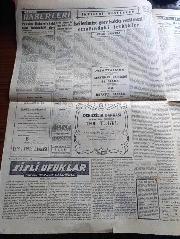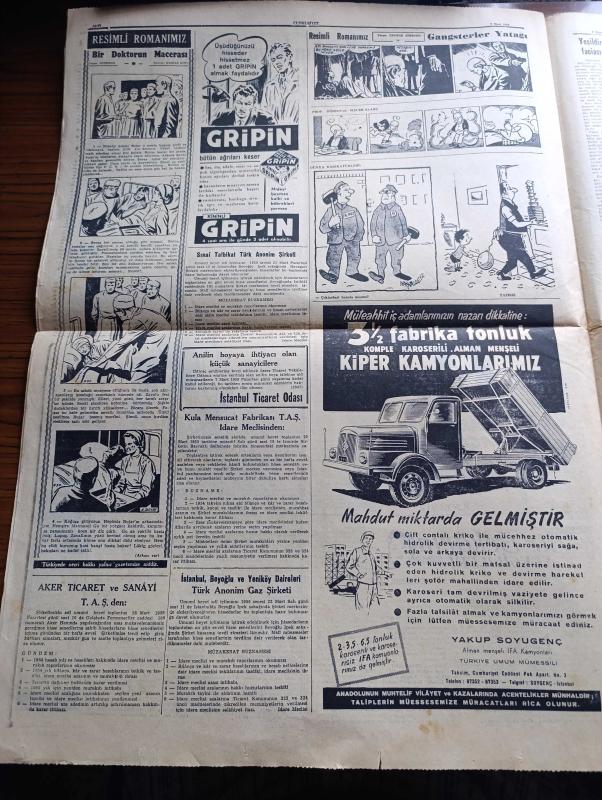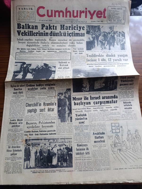 Cumhuriyet Gazetesi - 2 Mart 1955 - Balkan paktı Hariciye vekillerinin dünkü içtimaı - Yeşilırmak ve Kızılırmak ıslah edilecek - Ürdün'e hediye ettiğimiz uçaklar yola çıktı - Aydın'a bir askeri Amerikan uçağı düştü - churchill'in kremlin'e yaptığı sert ihtar - Londra büyükelçimiz Hüseyin Ragıp Baydur'un na'şı getiriliyor - yeşildirekte dünkü yangın faciası 1 ölü 12 yaralı var fotoğraf - Kıbrısa silah sokanlar - Mısır ile İsrail arasında başlayan çarpışmalar - Celal Bayar'ın pakistan'dan ayrılırken beyanatı fotoğraf - Ali Ulvi Karikatür - işçilerimize grev hakkı verilmesi etrafındaki tetkikler yazan Esad Tekeli - Üsküdar otobüsleri belediyeye devredildi - atom tankı yapıldı - mart ayı dert ayı yazan Burhan Felek - İstanbul Paris garnizon maçı - Galatasaray'ın 50. Yılı hazırlıkları - vahşi ihtiras filmi lüks sinemasında - avare filmi Çemberlitaş ve Şehzadebaşı yeni sinemalarında - İstanbul Belediyesi Şehir Tiyatroları dram kısmında altıncı kat komedi kısmında yelpaze - Gripin, Yunus Nadi tarafından kaleme alınmıştır. Cumhuriyet Gazetesi - 2 Mart 1955 - Balkan paktı Hariciye vekillerinin dünkü içtimaı - Yeşilırmak ve Kızılırmak ıslah edilecek - Ürdün'e hediye ettiğimiz uçaklar yola çıktı - Aydın'a bir askeri Amerikan uçağı düştü - churchill'in kremlin'e yaptığı sert ihtar - Londra büyükelçimiz Hüseyin Ragıp Baydur'un na'şı getiriliyor - yeşildirekte dünkü yangın faciası 1 ölü 12 yaralı var fotoğraf - Kıbrısa silah sokanlar - Mısır ile İsrail arasında başlayan çarpışmalar - Celal Bayar'ın pakistan'dan ayrılırken beyanatı fotoğraf - Ali Ulvi Karikatür - işçilerimize grev hakkı verilmesi etrafındaki tetkikler yazan Esad Tekeli - Üsküdar otobüsleri belediyeye devredildi - atom tankı yapıldı - mart ayı dert ayı yazan Burhan Felek - İstanbul Paris garnizon maçı - Galatasaray'ın 50. Yılı hazırlıkları - vahşi ihtiras filmi lüks sinemasında - avare filmi Çemberlitaş ve Şehzadebaşı yeni sinemalarında - İstanbul Belediyesi Şehir Tiyatroları dram kısmında altıncı kat komedi kısmında yelpaze - Gripin adlı eser Türkçe dilindedir.