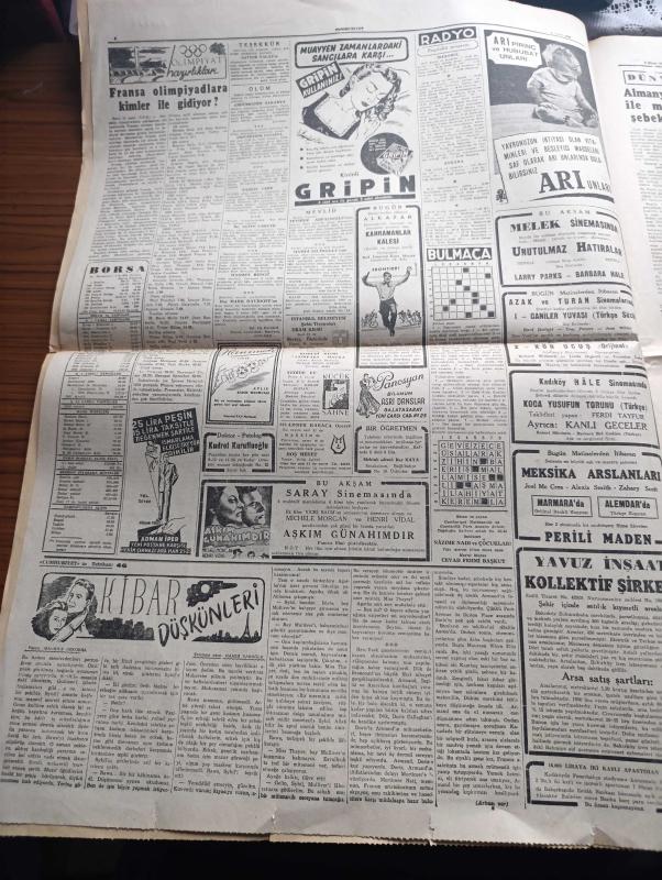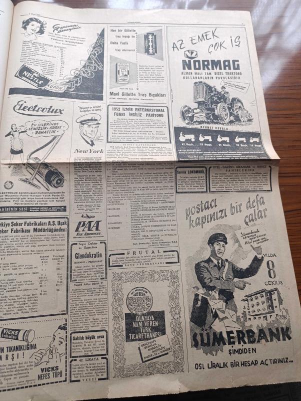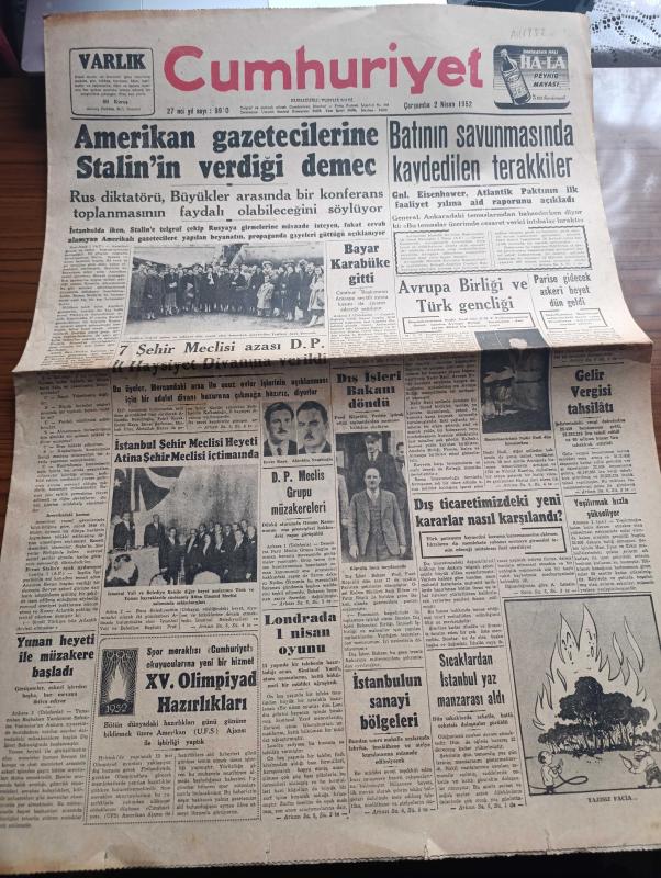 Cumhuriyet Gazetesi - 2 Nisan 1952 - Amerikan Gazetecilerine Stalin'in Verdiği Demeç - Celal Bayar Karabük'e Gitti - 15. Olimpiyat Hazırlıkları - Batı'nın Savunmasında Kaydedilen Terakkiler - Avrupa Birliği Ve Türk Gençliği - Londra'da 1 Nisan Oyunu - 7 Şehir Meclisi Azası Demokrat Parti'nin İl Haysiyet Divanına Verildi - Bir Beyaz Gömleklinin Dramı Yazan Doktor Burhan Öncel Yazı Dizisi - Panaroma Yazan Yakup Kadri Karaosmanoğlu Yazı Dizisi - Burhan Felek Köşe Yazısı - Fransa Olimpiyatlara Kimlerle Gidiyor - Borsa - Kibar Düşkünleri Yazan Maurice Dekobra Yazı Dizisi - Kahramanlar Kalesi Alkazar Sinemasında - Almanya'da Amerikalıların İzni İle Muazzam Bir Casusluk Şebekesi Vücuda Getirildi - Truman'ın Beyaz Sarayı Tamir Edildi - 1951 1952 Yunus Nadi Mükafatı En Güzel Şiir - Server Buzdolabı Gaz Yağı İle İşler - Nestle Chocolat - Gillette Traş Bıçağı - Ali Muhiddin Hacı Bekir - Pan Amerikan - Staalman İsveç Tencereleri - Miller Lastikleri - Cossor Radyoları - Sulfaderme Yanık Kremi adlı eser, Kitap > Süreli Yayınlar > Gazeteler > Türkiye > Genel > Günlük kategorisinde İkinci El olarak satıştadır.