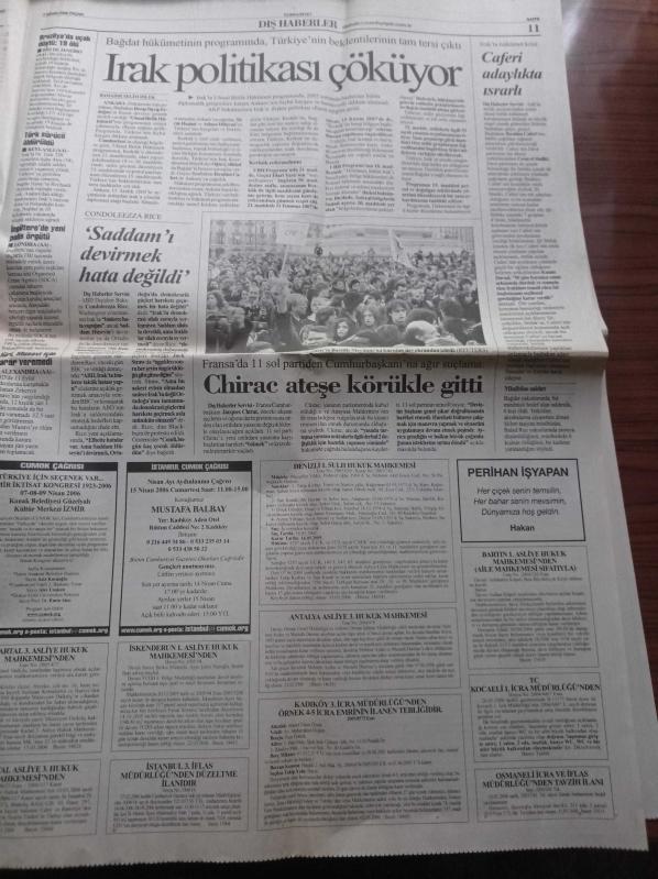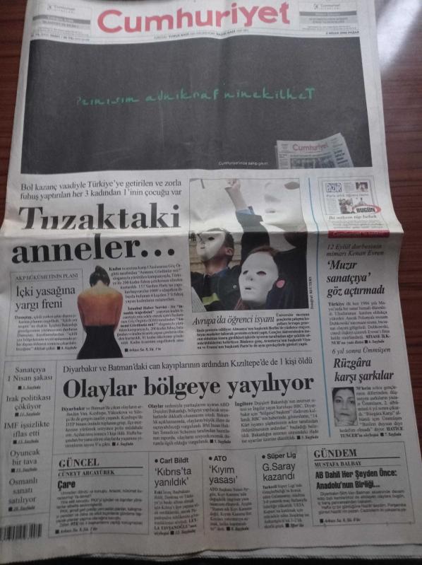 Cumhuriyet Gazetesi - 2 Nisan 2006 - Fuhuş Tuzağına Düşürülenlerin Çoğu Anne - AKP Hükümetinin Planı İçki Yasağına Yargı Freni - 12 Eylül Darbesinin Mimarı Kenan Evren Muzır Sanatçıya Göz Açtırmadı - 6 Yıl Sonra Ümmüşen Rüzgara Karşı Şarkılar - Galatasaray Kazandı - Diyarbakır Ve Batman'da Olaylar Bölgeye Yayılıyor adlı eser Türkçe dilindedir.
