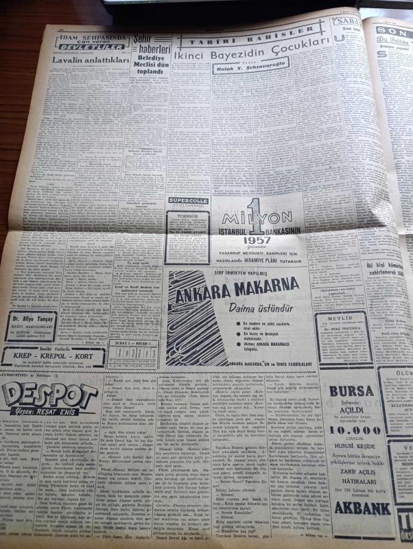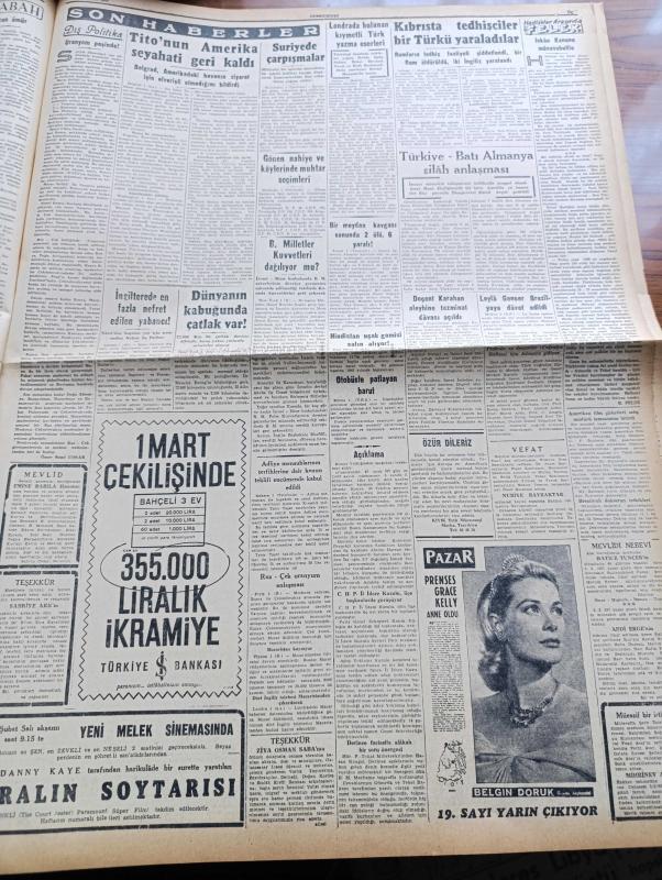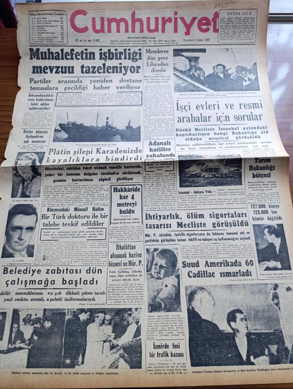 Cumhuriyet Gazetesi - 2 Şubat 1957 - Muhalefetin İşbirliği Mevzuu Tazeleniyor - Dokunulmazlıklarının Kaldırılması Taleb Edilen Milletvekilleri - Bütün Dünyayı İlgilendiren Aşk Macerası - Adnan Menderes Dün Gece Libya'dan Döndü - İşçi Evleri Ve Resmi Arabalar İçin Sorular - İhtiyarlık Ölüm Sigortaları Tasarısı Mecliste Görüşüldü - 127.000 Kişiye 125.000 Ton Kömür Dağıtıldı - Suudi Arabistan Kralı Suud Amerika'da 60 Cadillac Ismarladı - Belediye Zabıtası Dün Çalışmaya Başladı - İdam Sehpasında Can Veren Devletliler Derleyen Cemaleddin Saraçoğlu Yazı Dizisi - Despot Yazan Reşat Enis Yazı Dizisi - İkinci Bayezidin Çocukları Yazan Haluk Y. Şehsuvaroğlu - Tito'nun Amerika Seyahati Geri Kaldı - Kıbrıs'ta Tedhişçiler Bir Türkü Yaraladılar - Soprano Leyla Gencer Brezilyaya Davet Edildi - Londra'da Bulunan Kıymetli Türk Yazma Eserleri - Kadın Moda Köşesi - 1956 1957 Yunus Nadi Mükafatı Şiir Müsabakası - Resimli Romanımız Zırhlı Haydud Çeviren Mazhar Kunt Yazı Dizisi - Futbol Hakem Mektebi adlı eser, Kitap > Süreli Yayınlar > Gazeteler > Türkiye > Genel > Günlük kategorisinde İkinci El olarak satıştadır.