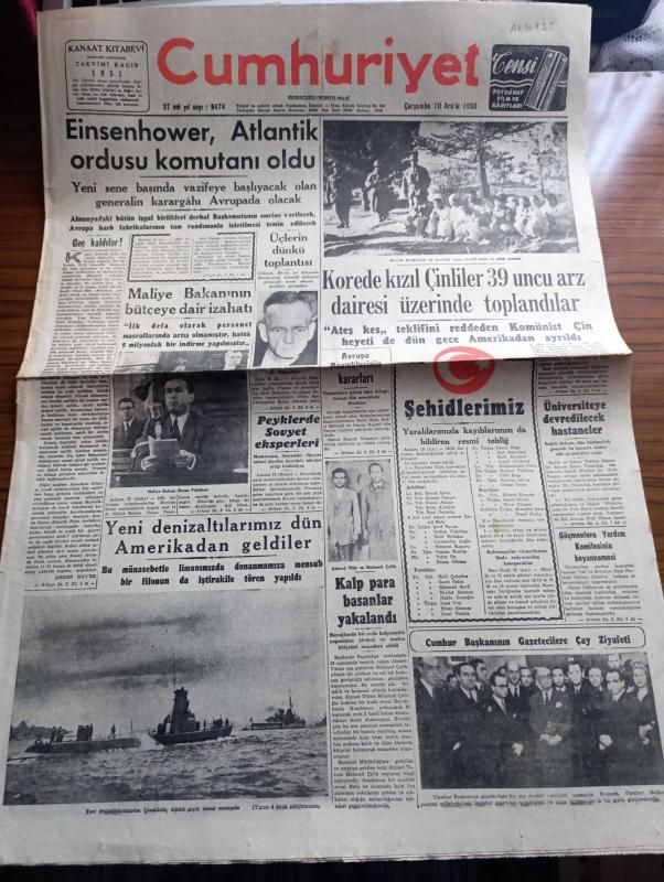Cumhuriyet Gazetesi - 20 Aralık 1950 - Geç Kaldılar yazan Abidin Daver Başmakale - Eisenhower Atlantik ordusu komutanı oldu - Kore'de Kızıl Çinliler 39. Arz dairesi üzerinde toplandılar arz dairesi üzerinde toplandılar - Kore'de birliğimizin ele geçirdiği Kuzey Koreli kadın ve erkek casuslar fotoğraf - Kore'deki şehit Yaralı ve kayıplarımızı bildiren resmi tebliğ - Kore kahramanları Amerika'nın sesi radyosundan konuşacaklar - Maliye Bakanı Hasan Polatkan'ın bütçeye dair izahatı - cumhurbaşkanı Celal Bayar'ın gazetecilere çay ziyafeti - yeni denizaltılarımız Dün Amerika'dan geldiler fotoğraf - İngiltere'ye Marshall yardımı kesilecek - Karanlık Oda Yazan Peride Celal Yazı Dizisi - Iwo Jima Yanıyor filmi Marmara ve çemberlitaş sinemasında - ahiret yolcuları filmi yurt sinemasında - Amerikalı güreşçiler Yarın uçakla geliyorlar fotoğraflar - Yaşar Doğunun rakibi Louis Heintz fotoğraf - Hamiyet Yüceses ve Ahmet Üstün Taksim kristal salonunda - Türkiye'den kore'dekilere mektup - Sümerbank adlı eser, Kitap > Süreli Yayınlar > Gazeteler > Türkiye > Genel > Günlük kategorisinde İkinci El olarak satıştadır.
