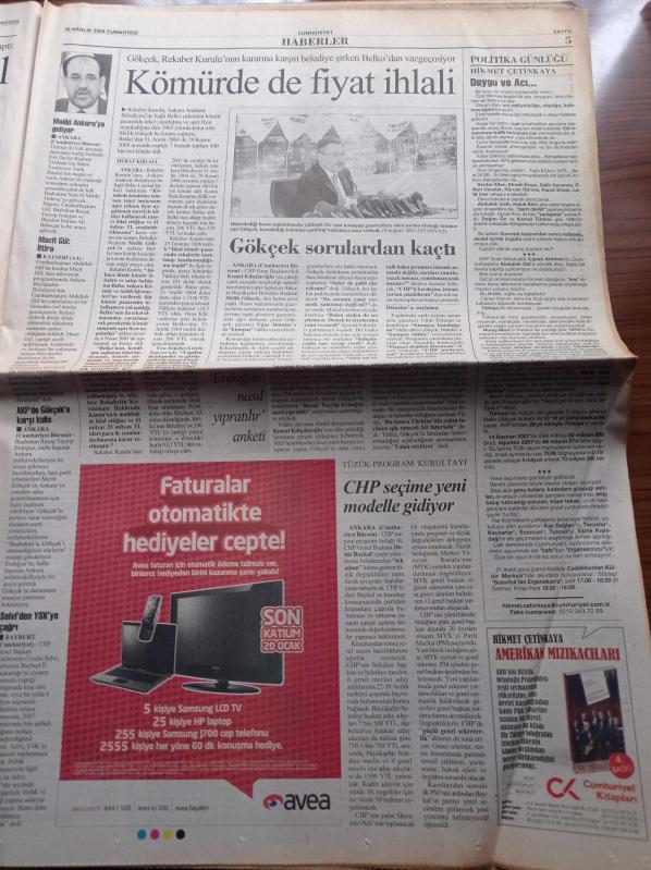 Cumhuriyet Gazetesi - 20 Aralık 2008 - İGDAŞ Davasında Kritik Süreç Başladı -Kerem Gönlüm Kırık Bilekle 17 Sayı - UEFA'da Tanıdık Rakip Bordeaux- Fenerbahçe - Ilısu'da Savaş Hali - Fazıl Say - Beethoven'in Yaralı Ruh - Genelkurmay'dan Ermenilerden Özür Dileme Kampanyasına Sert Tepki - Turgut Özakman - El Kaide Okul Açmış - Mahalle Baskısı Arttı - Recep Tayyip Erdoğan adlı eser Türkçe dilindedir.