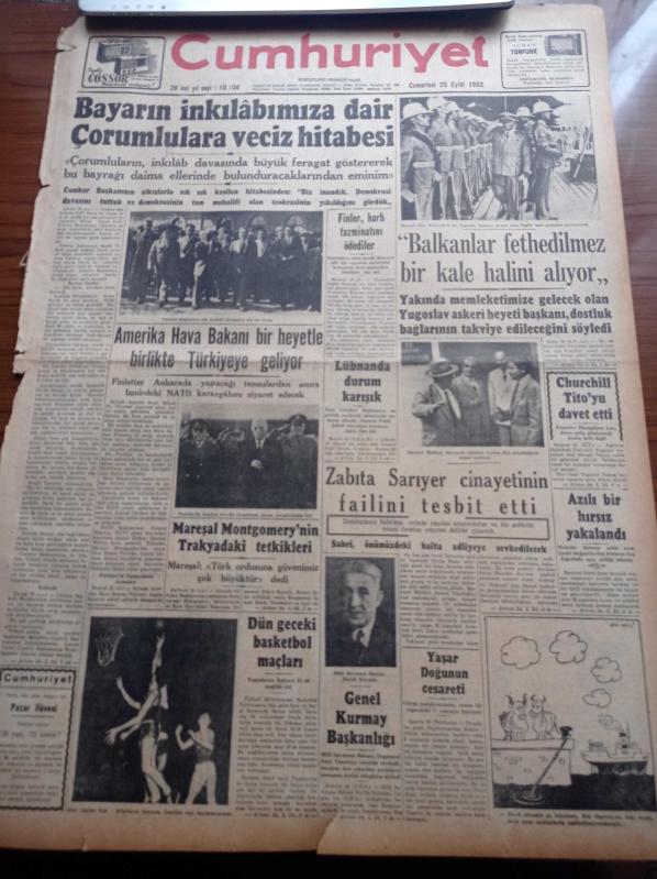 Cumhuriyet Gazetesi - 20 Eylül 1952 - Celal Bayar'ın İnkılabımıza Çorumlulara Veciz Hitabesi - Mareşal Tito Balkanlar Fethedilemez Bir Kale Halini Alıyor - Üçüncü Milletlerarası Basketbol Turnuvası - Amerika Hava Bakanı Finletter Bir Heyetle Birlikte Türkiye'ye Geliyor - Güreş Şampiyonumuz Yaşar Doğu'nun Cesareti - Zabıta Sarıyer Cinayetinin Failini Tesbit Etti - Kasım Gülek Askeri Mahkemeye Çağrıldı - İsmet İnönünün Büstü Tamir Dolasıyla Kaldırılmış - Afganistan Sovyet Notasını Reddetti - Devlet Demiryolları Umum Müdürü Zihni Üner - İpana Diş Macunu - Beograd S.K Takımı Bugün Galatasaray'la Karşılaşacak - Yüzme Şampiyonu Nehirde Boğuldu - Günün Resimleri - Siemens Perihan Altındağ'ın Radyosudur - Turner Diesel Traktörleri - Sabite Tur Gülerman Beyaz Parkta - Volvo T31 Traktör - Atomik Saatleri - Viktorya Dolmakalemleri- Duralex Sofra Takımları Gelmiştir, Yunus Nadi tarafından kaleme alınmıştır. Cumhuriyet Gazetesi - 20 Eylül 1952 - Celal Bayar'ın İnkılabımıza Çorumlulara Veciz Hitabesi - Mareşal Tito Balkanlar Fethedilemez Bir Kale Halini Alıyor - Üçüncü Milletlerarası Basketbol Turnuvası - Amerika Hava Bakanı Finletter Bir Heyetle Birlikte Türkiye'ye Geliyor - Güreş Şampiyonumuz Yaşar Doğu'nun Cesareti - Zabıta Sarıyer Cinayetinin Failini Tesbit Etti - Kasım Gülek Askeri Mahkemeye Çağrıldı - İsmet İnönünün Büstü Tamir Dolasıyla Kaldırılmış - Afganistan Sovyet Notasını Reddetti - Devlet Demiryolları Umum Müdürü Zihni Üner - İpana Diş Macunu - Beograd S.K Takımı Bugün Galatasaray'la Karşılaşacak - Yüzme Şampiyonu Nehirde Boğuldu - Günün Resimleri - Siemens Perihan Altındağ'ın Radyosudur - Turner Diesel Traktörleri - Sabite Tur Gülerman Beyaz Parkta - Volvo T31 Traktör - Atomik Saatleri - Viktorya Dolmakalemleri- Duralex Sofra Takımları Gelmiştir adlı eser Türkçe dilindedir.