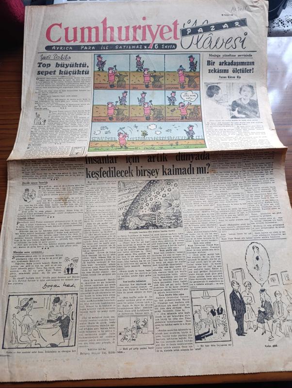 Sayfa Boyutu : 42*58 cm Sayfa Sayısı: 6 Cumhuriyet Pazar Gazetesi Yıpranma, sararmalar, kupon kesiği ve yırtılmalar zamana bağlı olarak görülebilir Bilgilendirme : Tam takım gazetedir