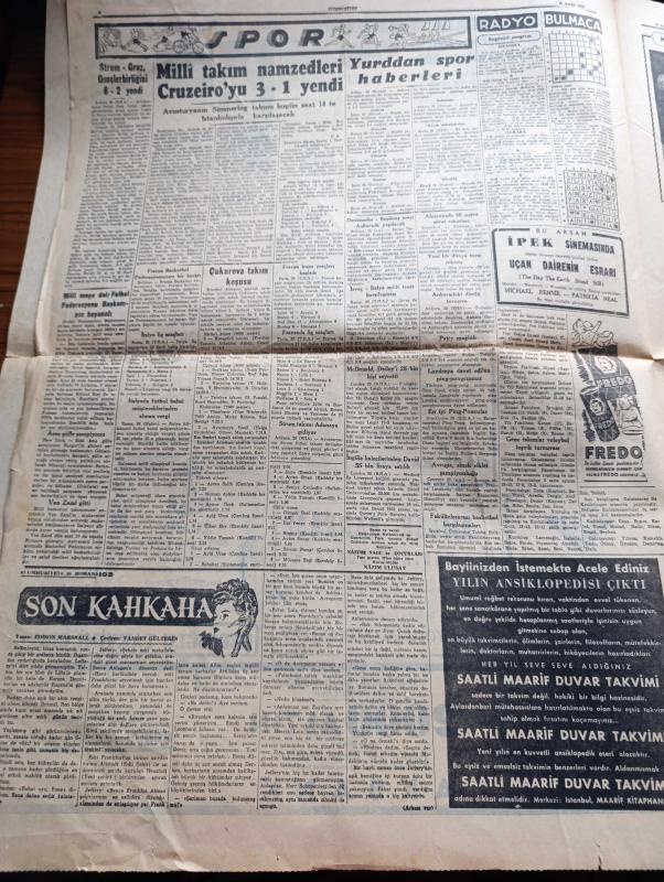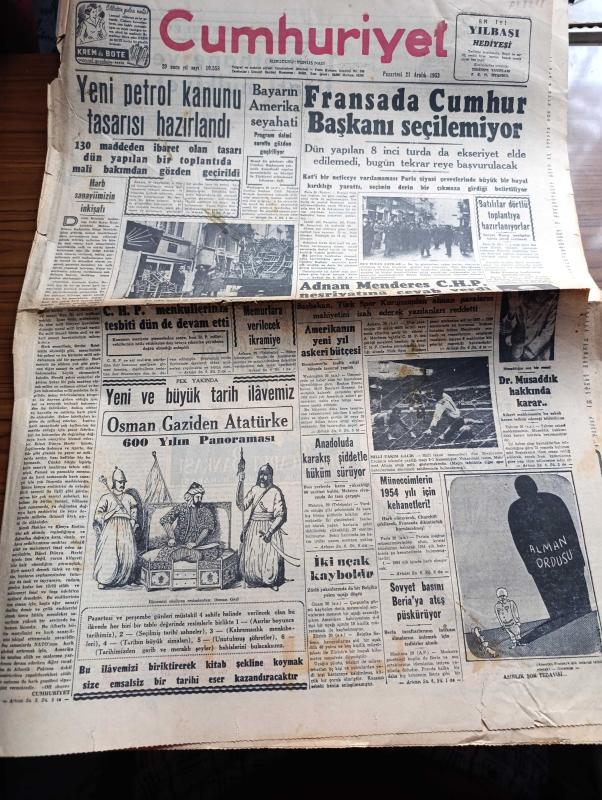 Cumhuriyet Gazetesi - 21 Aralık 1953 - Harp Sanayimizin inkişafı Köşe Yazısı - Yeni Petrol Kanunu Tasarısı Hazırlandı - Fransa'da Cumhurbaşkanı Seçilemiyor - Adnan Menderes CHP Neşriyatına Cevap Verdi - Milli Takım Namzetleri Dün Brezilyanın Cruzeiro Takımı İle Yaptığı Maçı 3 1 Kazanmıştır - İran'da Doktor Musaddık Hakkında Karar - Cüzamlı Kadın Yazan Guy Des Cars Yazı Dizisi - Büyük Atatürk İçin Okutturulan Mevlid - Allah Taksimi Yazan Burhan Felek Köşe Yazısı - Akbank - Çukurova Takım Koşusu - Milli Maça Dair Futbol Federasyonu Başkanı Orhan Şeref Apak'ın Beyanatı - Danimarka Beşiktaş Maçı Ankara'da Yapılacak - Şöhret Fabrikatörü Guido Orlando Yazı Dizisi - Krem Pertev - Vita Yağ - Siemens Alman Radyoları - Rally Traş Makinesi, Yunus Nadi tarafından kaleme alınmıştır. Cumhuriyet Gazetesi - 21 Aralık 1953 - Harp Sanayimizin inkişafı Köşe Yazısı - Yeni Petrol Kanunu Tasarısı Hazırlandı - Fransa'da Cumhurbaşkanı Seçilemiyor - Adnan Menderes CHP Neşriyatına Cevap Verdi - Milli Takım Namzetleri Dün Brezilyanın Cruzeiro Takımı İle Yaptığı Maçı 3 1 Kazanmıştır - İran'da Doktor Musaddık Hakkında Karar - Cüzamlı Kadın Yazan Guy Des Cars Yazı Dizisi - Büyük Atatürk İçin Okutturulan Mevlid - Allah Taksimi Yazan Burhan Felek Köşe Yazısı - Akbank - Çukurova Takım Koşusu - Milli Maça Dair Futbol Federasyonu Başkanı Orhan Şeref Apak'ın Beyanatı - Danimarka Beşiktaş Maçı Ankara'da Yapılacak - Şöhret Fabrikatörü Guido Orlando Yazı Dizisi - Krem Pertev - Vita Yağ - Siemens Alman Radyoları - Rally Traş Makinesi adlı eser Türkçe dilindedir.