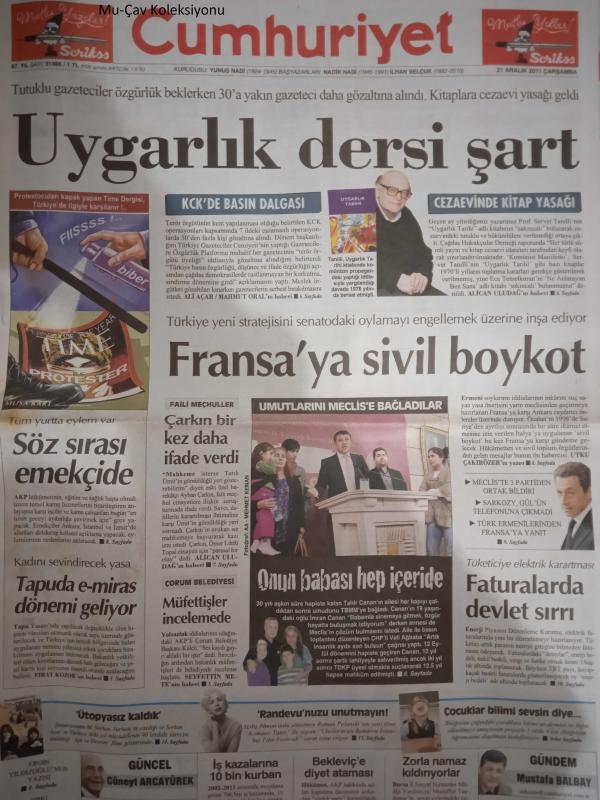 Cumhuriyet Gazetesi,21 Aralık 2011,Server Tanilli,Abdullah Öcalan,Tahir Canan,Ayhan Çarkın,Sarkozy,Tayfur Havutçu,Cornu,Şenol Güneş,Mehmet Ali Aydınlar,Muzaffer Taşdemir,Birgül Ayman Güler adlı eser Türkçe dilindedir.
