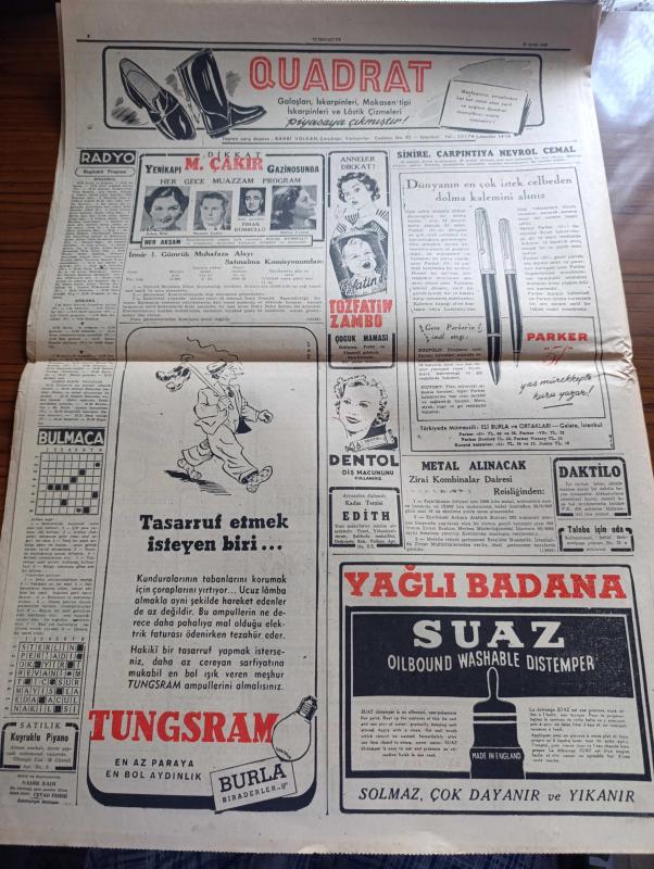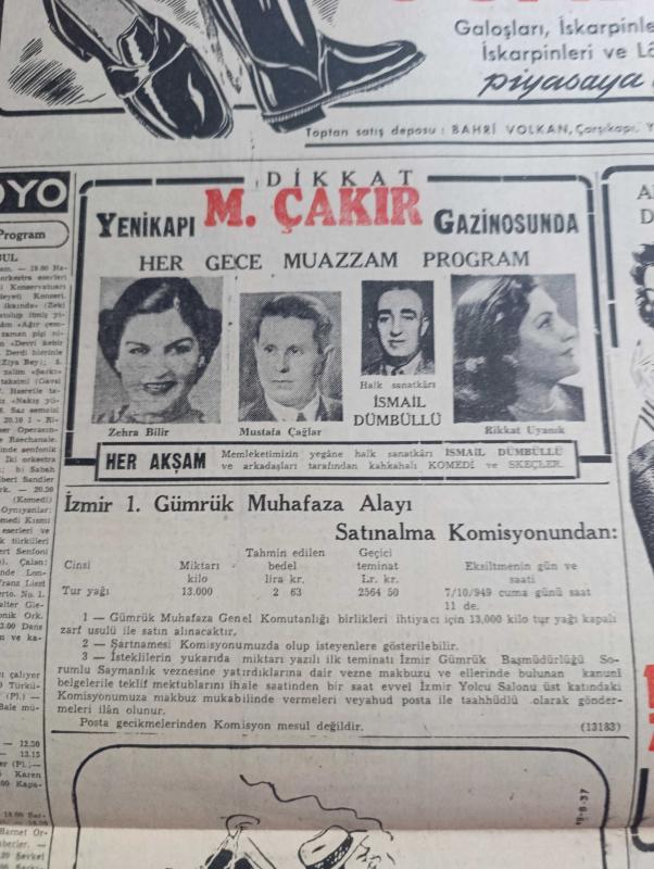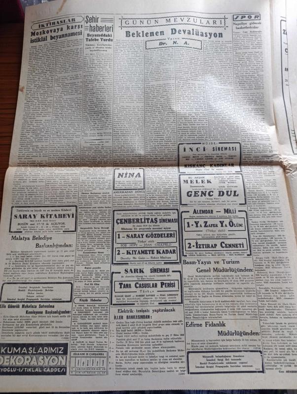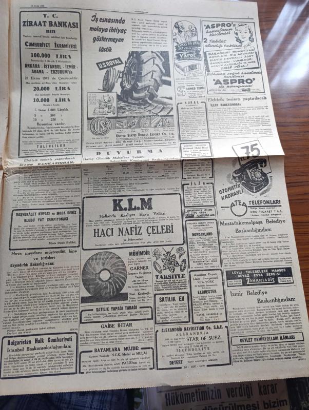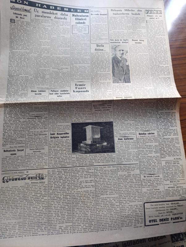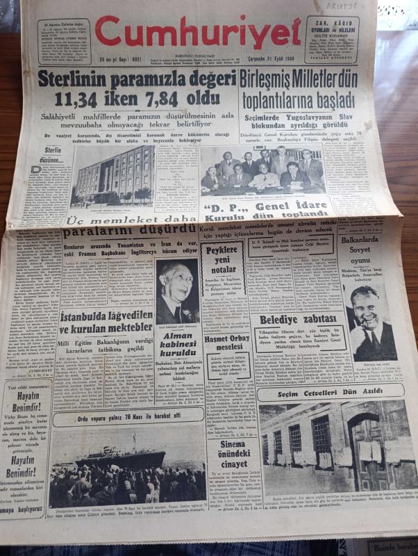 Cumhuriyet Gazetesi - 21 Eylül 1949 - sterlin düşünce Cumhuriyet Başmakale - sterlinin paramızla değeri 11, 34 iken 7,84 oldu - Üç memleket daha paralarını düşürdü - Birleşmiş Milletler Dün toplantılarına başladı - Demokrat Parti genel idare kurulu dün İstanbul'da yaptığı toplantı esnasında fotoğraf - balkanlarda Sovyet oyunu - Moskova tito'ya karşı bulgarlarla arnavutları kışkırtıyor - İstanbul'da lağvedilen ve kurulan mektepler - Alman kabinesi kuruldu - seçim cetvelleri asıldı fotoğraf - Ordu vapuru yalnız 76 hacı ile hareket etti - Beyoğlu istiklal'de Ar sineması önünde cinayet - ya Zafer ya ölüm filmi Alemdar ve milli sinemada - Tana Casuslar perisi filmi şark sinemasında - Turgut Reis yazan Halikarnas Balıkçısı - Hindistan'da Gandhi Günü - İzmir fuarı kapandı - Pompei'nin son günleri mi yazan Burhan Felek - yeni vergi kanunları yazan Aziz Tahsin Balkanlı Yazı Dizisi - Aspro ağrı kesici - Üsküdar Kız koleji -Zehra bilir Mustafa Çağlar İsmail Dümbüllü Yenikapı M. Çakır Gazinosunda, Yunus Nadi tarafından kaleme alınmıştır. Cumhuriyet Gazetesi - 21 Eylül 1949 - sterlin düşünce Cumhuriyet Başmakale - sterlinin paramızla değeri 11, 34 iken 7,84 oldu - Üç memleket daha paralarını düşürdü - Birleşmiş Milletler Dün toplantılarına başladı - Demokrat Parti genel idare kurulu dün İstanbul'da yaptığı toplantı esnasında fotoğraf - balkanlarda Sovyet oyunu - Moskova tito'ya karşı bulgarlarla arnavutları kışkırtıyor - İstanbul'da lağvedilen ve kurulan mektepler - Alman kabinesi kuruldu - seçim cetvelleri asıldı fotoğraf - Ordu vapuru yalnız 76 hacı ile hareket etti - Beyoğlu istiklal'de Ar sineması önünde cinayet - ya Zafer ya ölüm filmi Alemdar ve milli sinemada - Tana Casuslar perisi filmi şark sinemasında - Turgut Reis yazan Halikarnas Balıkçısı - Hindistan'da Gandhi Günü - İzmir fuarı kapandı - Pompei'nin son günleri mi yazan Burhan Felek - yeni vergi kanunları yazan Aziz Tahsin Balkanlı Yazı Dizisi - Aspro ağrı kesici - Üsküdar Kız koleji -Zehra bilir Mustafa Çağlar İsmail Dümbüllü Yenikapı M. Çakır Gazinosunda adlı eser Türkçe dilindedir.