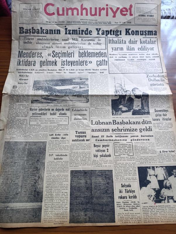 Cumhuriyet Gazetesi - 21 Eylül 1958 - Başbakan Adnan Menderes İzmir'de Yaptığı Konuşma - Adnan Menderes Seçimleri Beklemeden İktidara Gelmek İsteyenlere Çattı - İthalatta Dair Kotalar Yarın İlan Ediliyor - Nadir Nadi Köşe Yazısı - Fatin Rüştü Zorlu Dün John Foster Dulles İle Görüştü - Lübnan Başbakanı Sami El Sulh Dün Ansızın İstanbul'a Geldi - Tarsus Vapuru Satılacak Mı - Eskişehirde Uranyum Damarları - Sağlık Bakanı Lütfi Kırdar İstifa Etmedim Diyor - Osmanlı Donanmasının Tarihinde Karanlık Sayfalar Yazan Cemalettin Saraçoğlu Yazı Dizisi - Göç Yazan Necip Alsan Yazı Dizisi - Yeni Hasan'ın Karşısında Yazan Hasan Ali Yücel Köşe Yazısı - Hür Cezayir Hükümetini Tanıyanlar 5 e Yükseldi - İzmir Fuarı Kapandı - Bozcaadanın Kurtuluşunun 35. Yıldönümü - Haftanın Şakaları Yazan Burhan Felek Köşe Yazısı - 1958 1959 Yunus Nadi Armağanı Röportaj Müsabakası Ölümünden Onbeş Yıl Sonra Atatürk'ü Tekrar Gördüm Yazan Füruzan Hüsrev Tökim - Galatasaray Beşiktaş 130. Maçını Oynuyorlar adlı eser, Kitap > Süreli Yayınlar > Gazeteler > Türkiye > Genel > Günlük kategorisinde İkinci El olarak satıştadır.