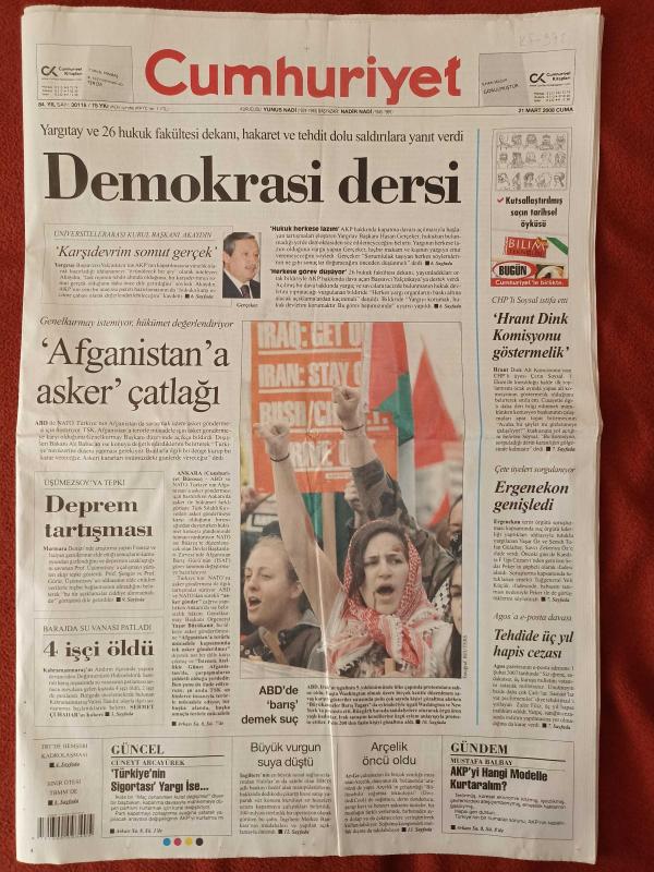 Cumhuriyet Gazetesi 21 Mart 2008 Demokrasi Dersi, Hemşeri Kadrolaşması,MHP'de Yoğun AKP Mesaisi,Gerçeker: Yargı Size De Lazım, Galatasaray'a Ulaşmak Zor,Zico'nun Sihirbazı Alex,Futbolla Yargıyı Karalıyorlar adlı eser, Kitap > Süreli Yayınlar > Gazeteler > Türkiye > Genel > Günlük kategorisinde İkinci El olarak satıştadır.