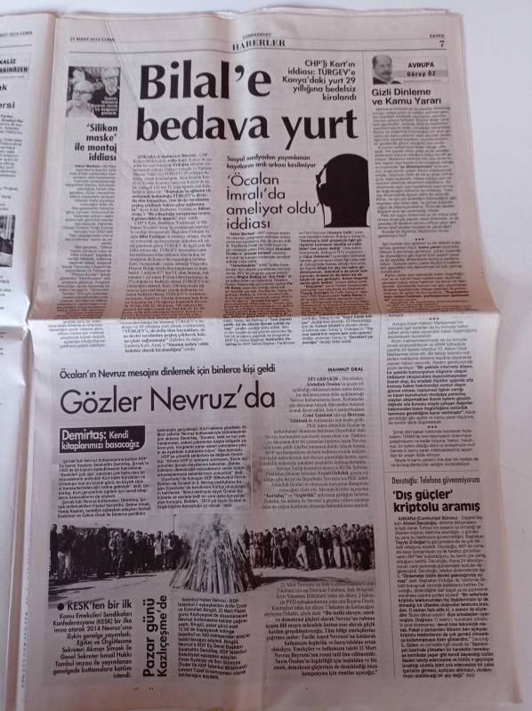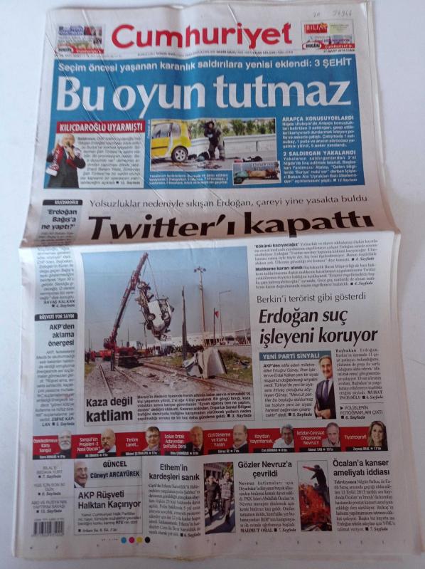 Cumhuriyet Gazetesi - 21 Mart 2014 - Beşiktaş Teknik Direktörü Slaven Bilic Hedef Şampiyonlar Ligi - Hevsel Bahçelerinde Artık Ağaç Kesilmeyecek - Yelkovan Kuşlarının Peşinde 2 Yıl - Recep Tayyip Erdoğan Twitter'ı Kapattı - Berkin Elvan'ı Terörist Gibi Gösterdi - Ethem Sarısülük'ün Kardeşleri Sanık - Seçim Öncesi Karanlık Oyunlar adlı eser Türkçe dilindedir.