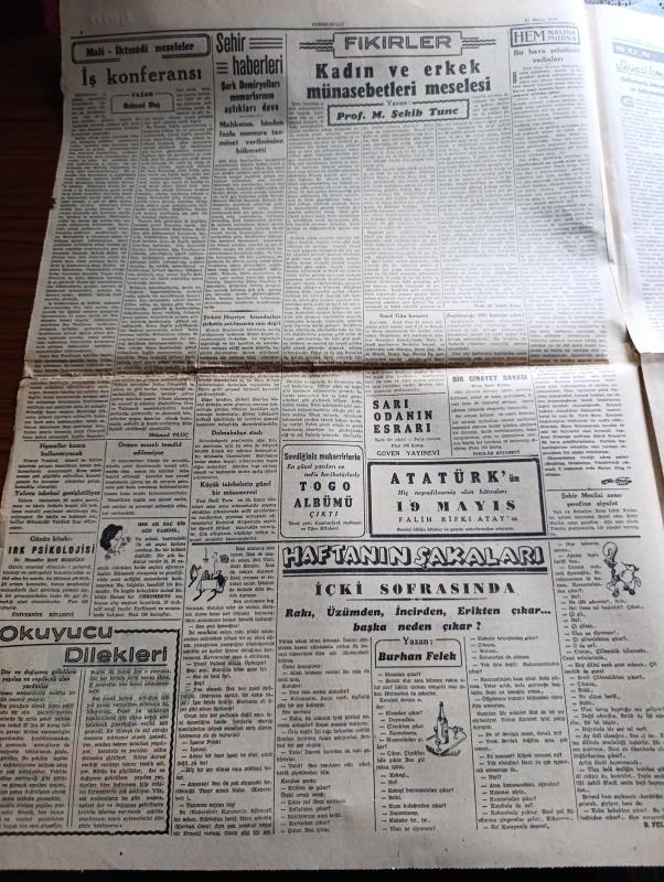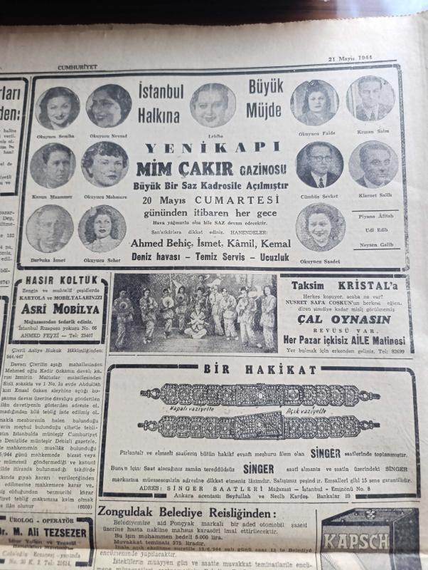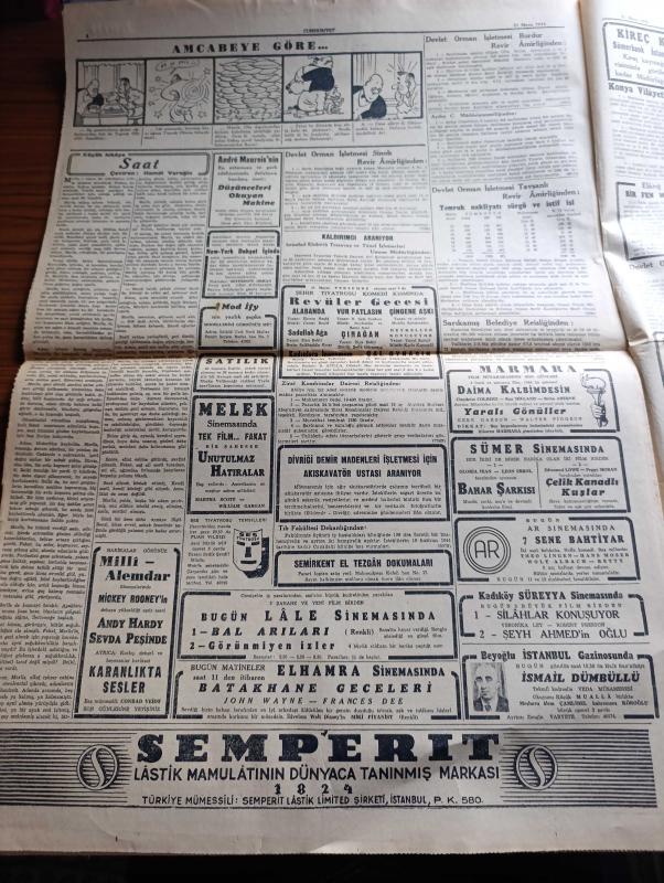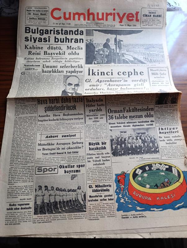 Cumhuriyet Gazetesi - 21 Mayıs 1944 - nutuk'tan sonra yazan Nadir Nadi Başmakale - Bulgaristan'da siyasi buhran kabine düştü meclis reisi başvekil oldu - 19 Mayıs stadında evvelki gün yapılan tören esnasında Milli Şef İsmet İnönü ve Türk gençliği fotoğraf - İtalya'da Hitler hattı yarıldı - hava harbi daha fazla şiddetlendirilecek - orman fakültesinden 36 talebe mezun oldu - maarifçilerin Milli şefe arizaları - okullar Spor Bayramı - Filistin'e büyük miktarda mal kaçıran bir Yahudi kadını yakalandı - Mussolinin gazetesi tarafından verilen haber General Mihailoviç öldürülmüş - haftanın şakaları yazan Burhan Felek - Dolmabahçe stadı - sokaktan Gelen Kadın yazan Esat Mahmut Karakurt Yazı dizisi - Stalin Yugoslav heyetini kabul etti - Bahar şarkısı ve Çelik kanatlı kuşlar filmi Sümer sinemasında - 7 sene Bahtiyar filmi bugün Ar sinemasında - İsmail dümbüllü Beyoğlu İstanbul Gazinosu'nda - çal oynasın revüsü Taksim Kristal'de - Ticaret borsası tellalı Şerafettin Gülsöyle - radyo programı adlı eser, Kitap > Süreli Yayınlar > Gazeteler > Türkiye > Genel > Günlük kategorisinde İkinci El olarak satıştadır.