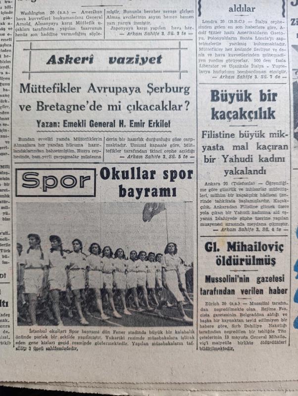 Cumhuriyet Gazetesi - 21 Mayıs 1944 - nutuk'tan sonra yazan Nadir Nadi Başmakale - Bulgaristan'da siyasi buhran kabine düştü meclis reisi başvekil oldu - 19 Mayıs stadında evvelki gün yapılan tören esnasında Milli Şef İsmet İnönü ve Türk gençliği fotoğraf - İtalya'da Hitler hattı yarıldı - hava harbi daha fazla şiddetlendirilecek - orman fakültesinden 36 talebe mezun oldu - maarifçilerin Milli şefe arizaları - okullar Spor Bayramı - Filistin'e büyük miktarda mal kaçıran bir Yahudi kadını yakalandı - Mussolinin gazetesi tarafından verilen haber General Mihailoviç öldürülmüş - haftanın şakaları yazan Burhan Felek - Dolmabahçe stadı - sokaktan Gelen Kadın yazan Esat Mahmut Karakurt Yazı dizisi - Stalin Yugoslav heyetini kabul etti - Bahar şarkısı ve Çelik kanatlı kuşlar filmi Sümer sinemasında - 7 sene Bahtiyar filmi bugün Ar sinemasında - İsmail dümbüllü Beyoğlu İstanbul Gazinosu'nda - çal oynasın revüsü Taksim Kristal'de - Ticaret borsası tellalı Şerafettin Gülsöyle - radyo programı, Yunus Nadi tarafından kaleme alınmıştır. Cumhuriyet Gazetesi - 21 Mayıs 1944 - nutuk'tan sonra yazan Nadir Nadi Başmakale - Bulgaristan'da siyasi buhran kabine düştü meclis reisi başvekil oldu - 19 Mayıs stadında evvelki gün yapılan tören esnasında Milli Şef İsmet İnönü ve Türk gençliği fotoğraf - İtalya'da Hitler hattı yarıldı - hava harbi daha fazla şiddetlendirilecek - orman fakültesinden 36 talebe mezun oldu - maarifçilerin Milli şefe arizaları - okullar Spor Bayramı - Filistin'e büyük miktarda mal kaçıran bir Yahudi kadını yakalandı - Mussolinin gazetesi tarafından verilen haber General Mihailoviç öldürülmüş - haftanın şakaları yazan Burhan Felek - Dolmabahçe stadı - sokaktan Gelen Kadın yazan Esat Mahmut Karakurt Yazı dizisi - Stalin Yugoslav heyetini kabul etti - Bahar şarkısı ve Çelik kanatlı kuşlar filmi Sümer sinemasında - 7 sene Bahtiyar filmi bugün Ar sinemasında - İsmail dümbüllü Beyoğlu İstanbul Gazinosu'nda - çal oynasın revüsü Taksim Kristal'de - Ticaret borsası tellalı Şerafettin Gülsöyle - radyo programı adlı eser Türkçe dilindedir.