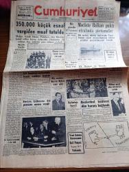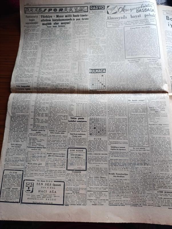 Cumhuriyet Gazetesi - 21 Mayıs 1955 - meclis tatile girerken yazan Nadir Nadi Başmakale - 350.000 küçük esnaf vergiden muaf tutuldu - Bir günde 47 kanun - mecliste balkan paktı etrafında görüşmeler - Almanya tarafsız tampon devlet olmayacak - VI. Bahar ve Çiçek Bayramı Dün açıldı - Hilton Oteli Dün işletmeye açıldı - Akif mecmuası neşriyat müdürü Cüneyt Arcayürek Tevkif edildi fotoğraf - İngiltere'de seçim hazırlığı - basketbolda takımına sahadan çeken Fenerbahçe umumi kaptanı Hayrullah Güvenir'e 6 ay hak mahrumiyeti cezası verildi - Fatin Rüştü Zorlu'nun beyanatı - Tenis kraliçesi Maureen Connolly fotoğraf - Üç misli mi oldu yazan Burhan Felek - Galatasaraylı basketçi Özer Salnur ameliyat oldu - İstanbul amatör birinci küme şampiyonu Karagümrük Adana'ya gitti - İstanbul Ankara Radyosu Programı - Hacı Ağa Opereti Ses Tiyatrosunda - Fluminense takımını bugün seyredeceğiz - dünya karikatürleri - 1954-1955 Yunus Nadi Mükafatı En Güzel Fikir Yazısı - M. Çakır Gazinosu Bayramda açılıyor adlı eser, Kitap > Süreli Yayınlar > Gazeteler > Türkiye > Genel > Günlük kategorisinde İkinci El olarak satıştadır.