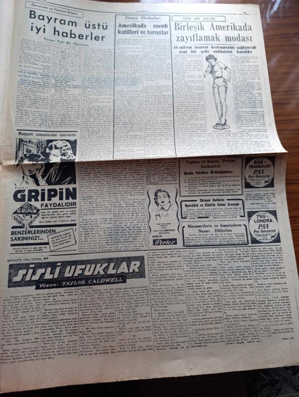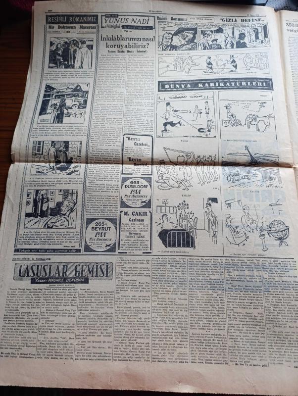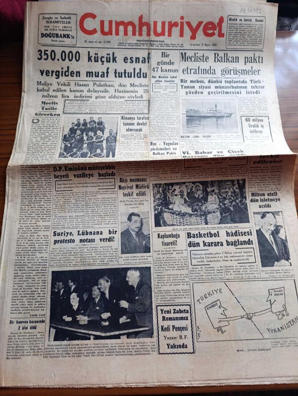 Cumhuriyet Gazetesi - 21 Mayıs 1955 - meclis tatile girerken yazan Nadir Nadi Başmakale - 350.000 küçük esnaf vergiden muaf tutuldu - Bir günde 47 kanun - mecliste balkan paktı etrafında görüşmeler - Almanya tarafsız tampon devlet olmayacak - VI. Bahar ve Çiçek Bayramı Dün açıldı - Hilton Oteli Dün işletmeye açıldı - Akif mecmuası neşriyat müdürü Cüneyt Arcayürek Tevkif edildi fotoğraf - İngiltere'de seçim hazırlığı - basketbolda takımına sahadan çeken Fenerbahçe umumi kaptanı Hayrullah Güvenir'e 6 ay hak mahrumiyeti cezası verildi - Fatin Rüştü Zorlu'nun beyanatı - Tenis kraliçesi Maureen Connolly fotoğraf - Üç misli mi oldu yazan Burhan Felek - Galatasaraylı basketçi Özer Salnur ameliyat oldu - İstanbul amatör birinci küme şampiyonu Karagümrük Adana'ya gitti - İstanbul Ankara Radyosu Programı - Hacı Ağa Opereti Ses Tiyatrosunda - Fluminense takımını bugün seyredeceğiz - dünya karikatürleri - 1954-1955 Yunus Nadi Mükafatı En Güzel Fikir Yazısı - M. Çakır Gazinosu Bayramda açılıyor, Yunus Nadi tarafından kaleme alınmıştır. Cumhuriyet Gazetesi - 21 Mayıs 1955 - meclis tatile girerken yazan Nadir Nadi Başmakale - 350.000 küçük esnaf vergiden muaf tutuldu - Bir günde 47 kanun - mecliste balkan paktı etrafında görüşmeler - Almanya tarafsız tampon devlet olmayacak - VI. Bahar ve Çiçek Bayramı Dün açıldı - Hilton Oteli Dün işletmeye açıldı - Akif mecmuası neşriyat müdürü Cüneyt Arcayürek Tevkif edildi fotoğraf - İngiltere'de seçim hazırlığı - basketbolda takımına sahadan çeken Fenerbahçe umumi kaptanı Hayrullah Güvenir'e 6 ay hak mahrumiyeti cezası verildi - Fatin Rüştü Zorlu'nun beyanatı - Tenis kraliçesi Maureen Connolly fotoğraf - Üç misli mi oldu yazan Burhan Felek - Galatasaraylı basketçi Özer Salnur ameliyat oldu - İstanbul amatör birinci küme şampiyonu Karagümrük Adana'ya gitti - İstanbul Ankara Radyosu Programı - Hacı Ağa Opereti Ses Tiyatrosunda - Fluminense takımını bugün seyredeceğiz - dünya karikatürleri - 1954-1955 Yunus Nadi Mükafatı En Güzel Fikir Yazısı - M. Çakır Gazinosu Bayramda açılıyor adlı eser Türkçe dilindedir.