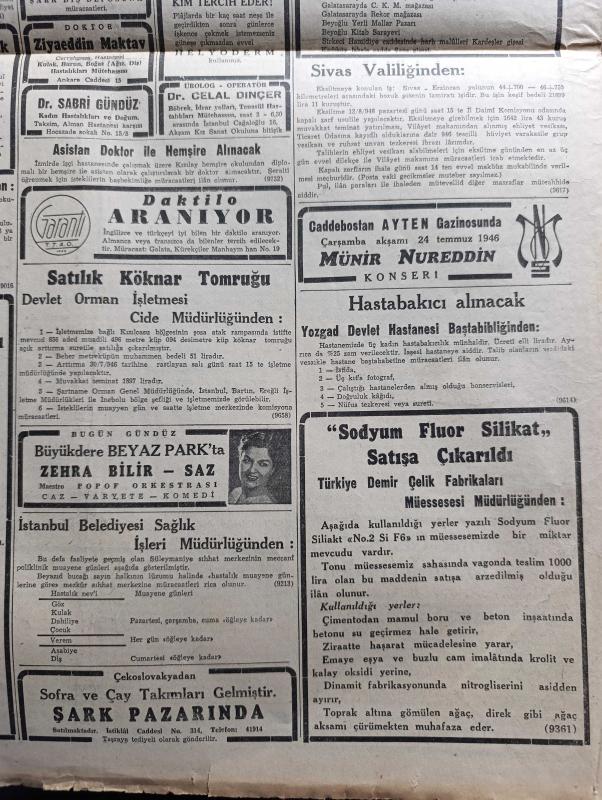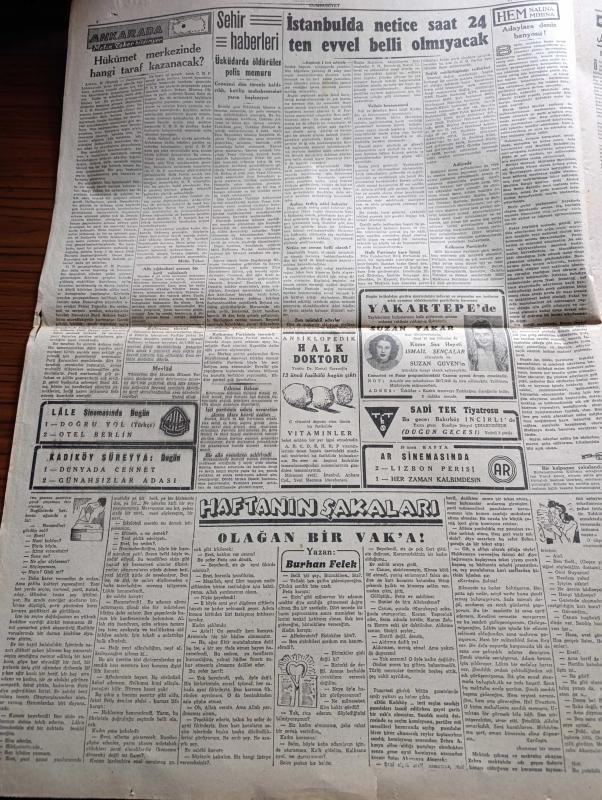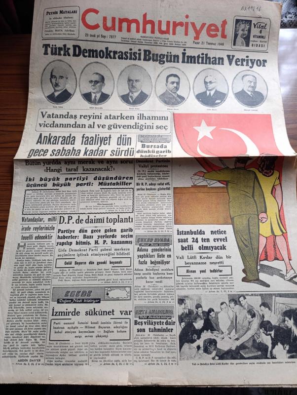Cumhuriyet Gazetesi - 21 Temmuz 1946 - vatandaşlar Milli irade reylerinizle tecelli edecektir yazan Abidin Daver Başmakale - Türk demokrasisi bugün imtihan ediyor - İsmet İnönü Şükrü Saraçoğlu Recep Peker Hikmet Bayur Celal Bayar ve Mareşal Fevzi Çakmak fotoğraf - Marmara Bölgesi seçiminde Necmi Erkmen bildiriyor - Demokrat Parti'nin Vali protestosu - Ankara'da seçim faaliyeti dün gece sabaha kadar sürdü - İki büyük partiyi düşündüren üçüncü büyük parti müstakiller - İstanbul'da seçim neticesi saat 24.00'den evvel belli olmayacak - Vali ve belediye reisi Lütfi Kırdar Dün gazetecilere seçim etrafında son hazırlıkları anlatırken fotoğraf - Ege'de seçim Doğan Nadi bildiriyor - çukurova'da seçim Ahmet İhsan bildiriyor - haftanın şakaları yazan Burhan Felek - Suzan yakar ve Suzan Güven Yakartepe'de - Sonsuz Panayır yazan Halide Edip Adıvar Yazı Dizisi - CHP İstanbul adayları listesi - Demokrat Parti İstanbul adayları listesi - Amcabey ve içki Çizen Cemal Nadir - dünkü at yarışı neticeleri adlı eser, Kitap > Süreli Yayınlar > Gazeteler > Türkiye > Genel > Günlük kategorisinde İkinci El olarak satıştadır.