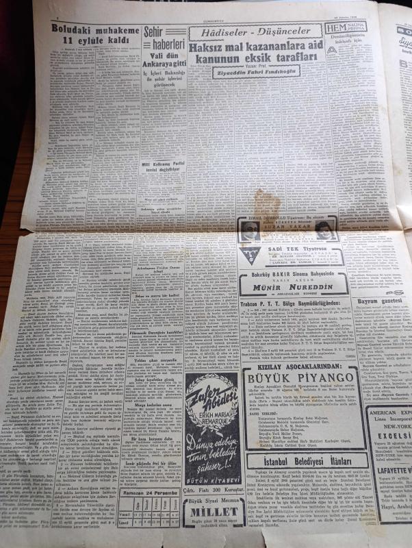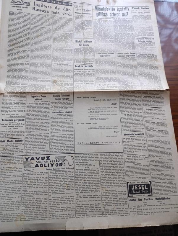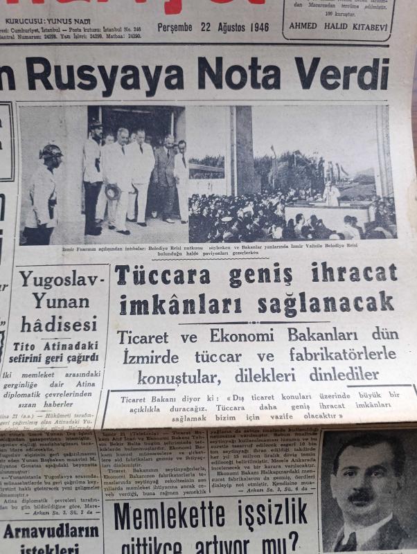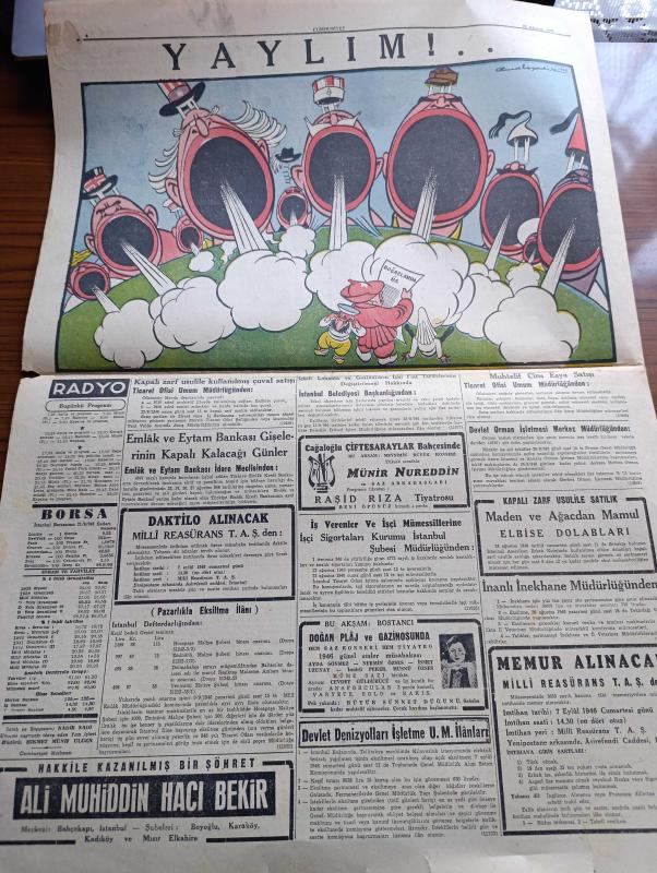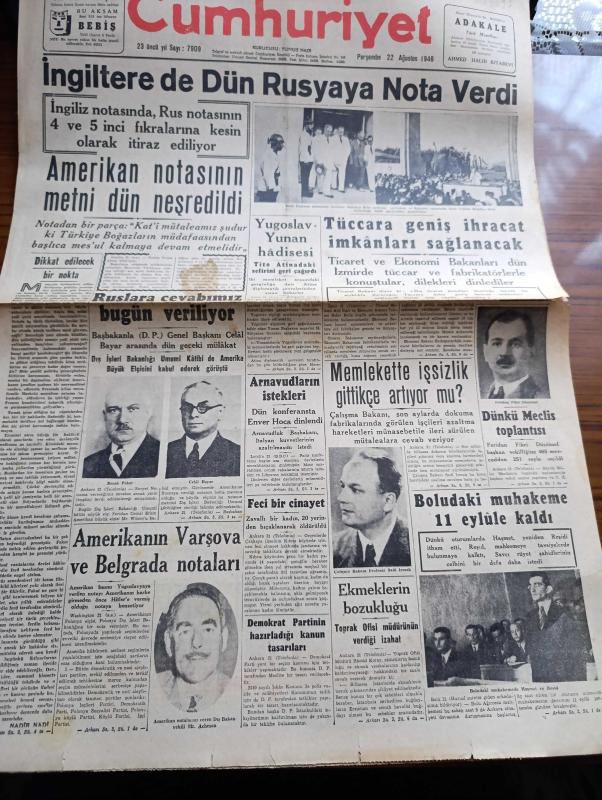 Cumhuriyet Gazetesi - 22 Ağustos 1946 - Dikkat Edilecek İki Nokta Yazan Nadir Nadi Başmakale - İngiltere de Dün Rusya'ya Nota Verdi - Amerikan Notasının Metni Dün Neşredildi - İzmir Fuarının Açılışından Fotoğraflar - Başbakan Recep Peker İle Demokrat Parti Genel Başkanı Celal Arasındaki Dün Geceki Mülakat - Memlekette İşsizlik Gittikçe Artıyor Mu - Ekmeklerin Bozukluğu - Arnavutların İstekleri Dün Konferansta Enver Hoca Dinlendi - Milli Kalkınma Partisi İsmini Değiştiriyor - İsmail Dümbüllü Tiyatrosu Bu Akşam Kadıköy Süreyya Bahçesinde - Sadi Tek Tiyatrosu Bu Gece Üsküdar Doğancılar Ayparkta - Yavuz Sultan Selim Ağlıyor Yazan Feridun Fazıl Tülbentçi Yazı Dizisi - Irak'ta Zelzele - Tekel Satış Yerleri Kapatılıyor - Yaylım Cemal Nadir Renkli Karikatür - Bugünkü Radyo Programı - Münir Nurettin Selçuk Ve Raşid Rıza Tiyatrosu Cağaloğlu Çiftesaraylar Bahçesinde - Ayda Sönmez Ve Nermin Özses Doğan Plaj Ve Gazinosunda - Bugünkü Radyo Programı - Ali Muhiddin Hacı Bekir - Borsa adlı eser, Kitap > Süreli Yayınlar > Gazeteler > Türkiye > Genel > Günlük kategorisinde İkinci El olarak satıştadır.