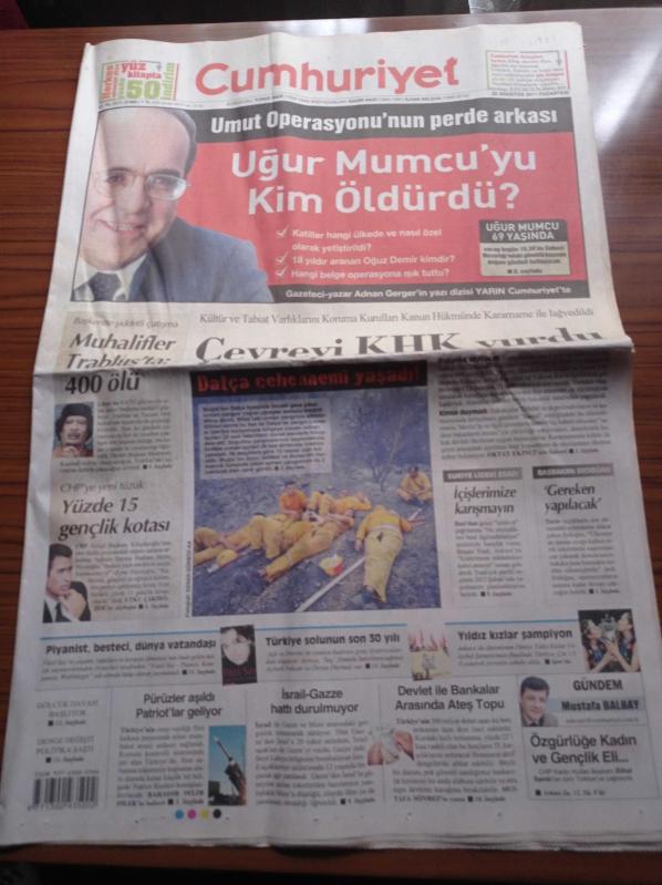 Cumhuriyet Gazetesi - 22 Ağustos 2011 - Ulusal Kadın Voleybol Takımımız Dünya Şampiyonu - 26. Üniversiteler Yaz Oyunları - Amazon Kadınları Köyüne Döndü - Şirinler - Çevreyi KHK Vurdu- Uğur Mumcu'yu Kim Öldürdü - Muhalifler Trablus'ta 400 Ölü - Ankara Barosu Başkanı Metin Feyzioğlu - Beşar Esad İçişlerimize Karışmayın - Recep Tayyip Erdoğan adlı eser Türkçe dilindedir.
